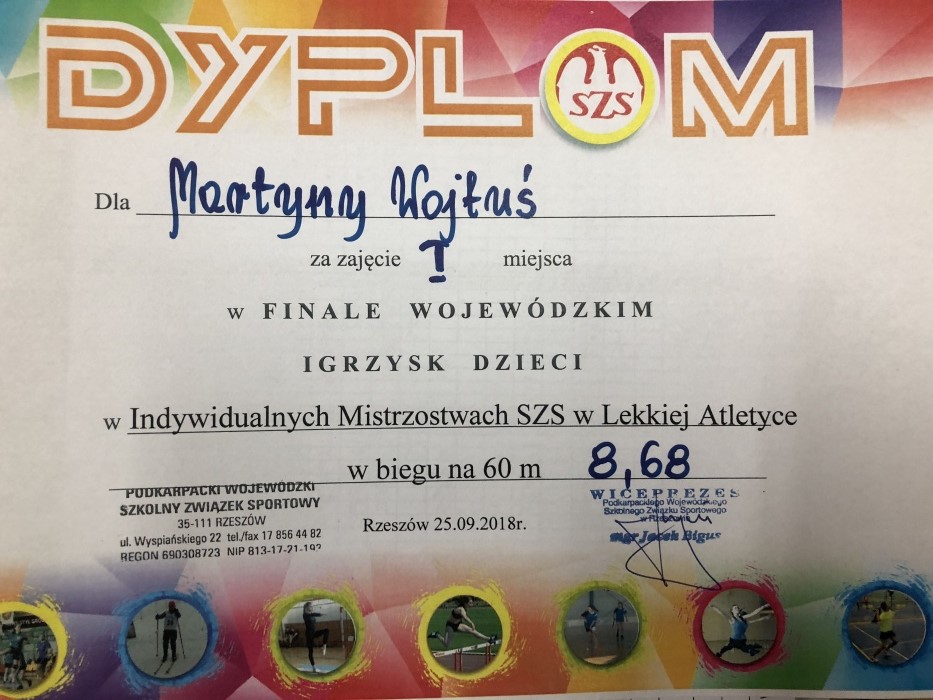Martyna Wojtuś – miejsce I bieg 60m. – czas 8,68s. – najlepsza zawodniczka województwa podkarpackiego