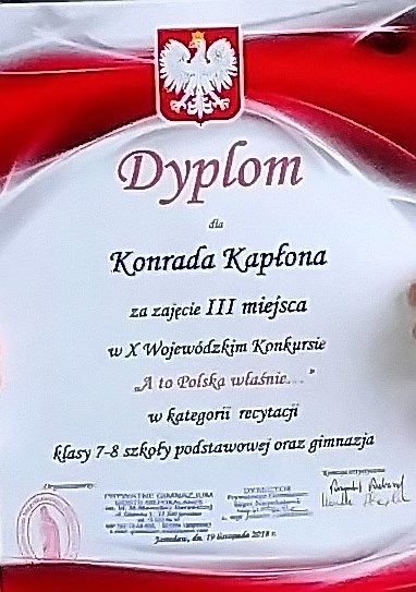 Uczeń naszej szkoły - Konrad Kapłon zajął III miejsce w Wojewódzkim Konkursie Recytatorskim pod hasłem A to Polska właśnie… Podczas tej jubileuszowej X edycji uczniowie recytowali wiersze patriotyczne, nawiązujące do 100. rocznicy odzyskania niepodległości. Konkurs zorganizowany został