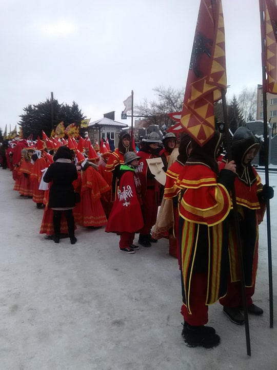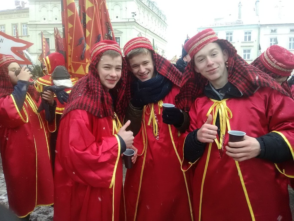 Naszą szkołę reprezentowali uczniowie w strojach żołnierzy oraz uczennice jako śnieżynki - wszyscy wchodzili w skład Orszaku Europejskiego Króla Kacpra. Uczestnicy mieli stroje w kolorze czerwonym. Przemarsz Orszaku rozpoczął się od Kościoła Chrystusa Króla i ulicami Jarosławia dotarł na Rynek. Tu połączył się z Orszakiem Azjatyckim (kolor zielony) i Orszakiem Afrykańskim (kolor niebieski). Następnie odbyła się główna część uroczystości - nawiązanie do tradycji jasełek oraz wspólne kolędowanie, życzenia i dzielenie się opłatkiem.