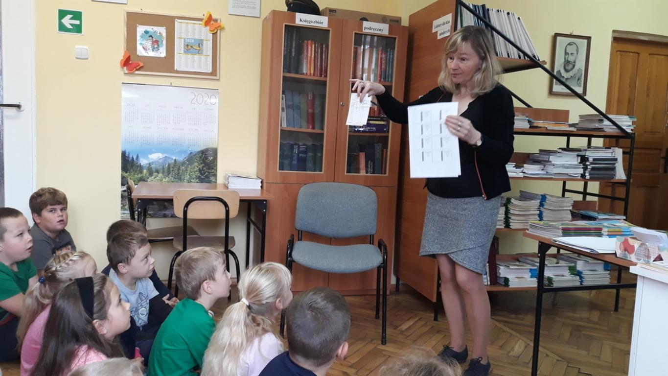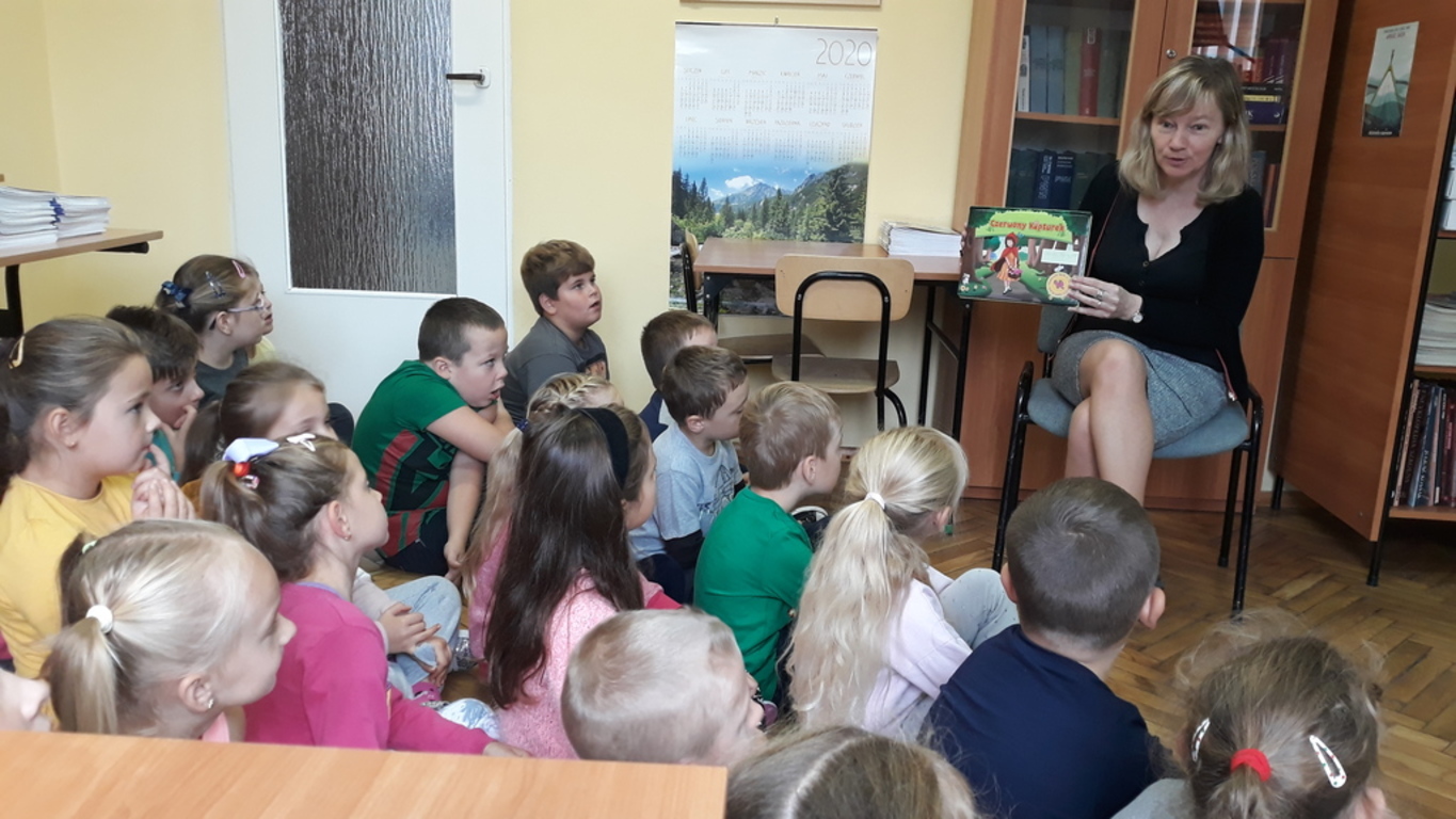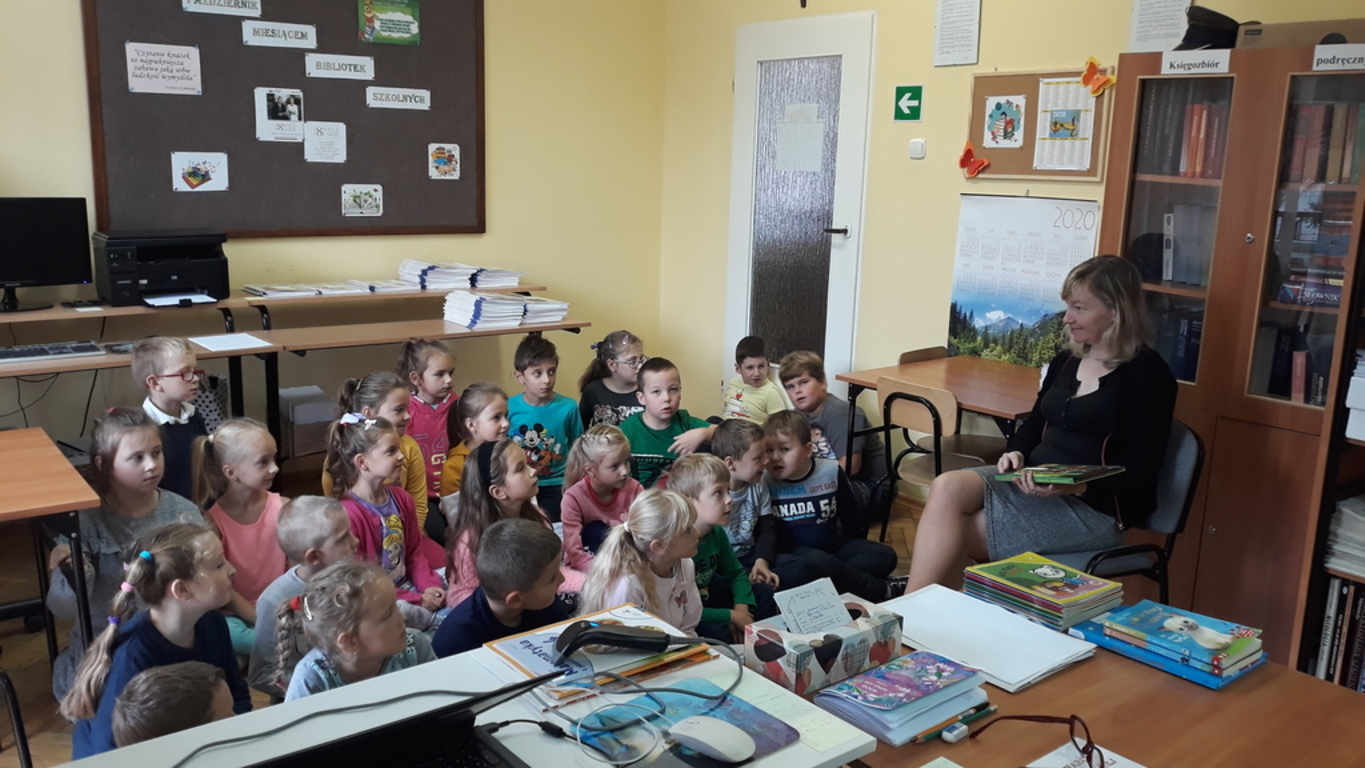 Dzieci zostały zapoznane z regulaminem biblioteki szkolnej. Zajęcia biblioteczne zostały wzbogacone odczytaniem przez Panią bibliotekarkę bajki pt. „Czerwony Kapturek".