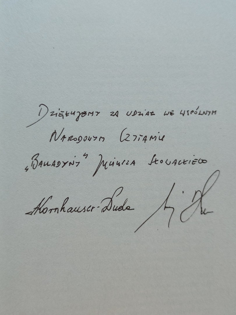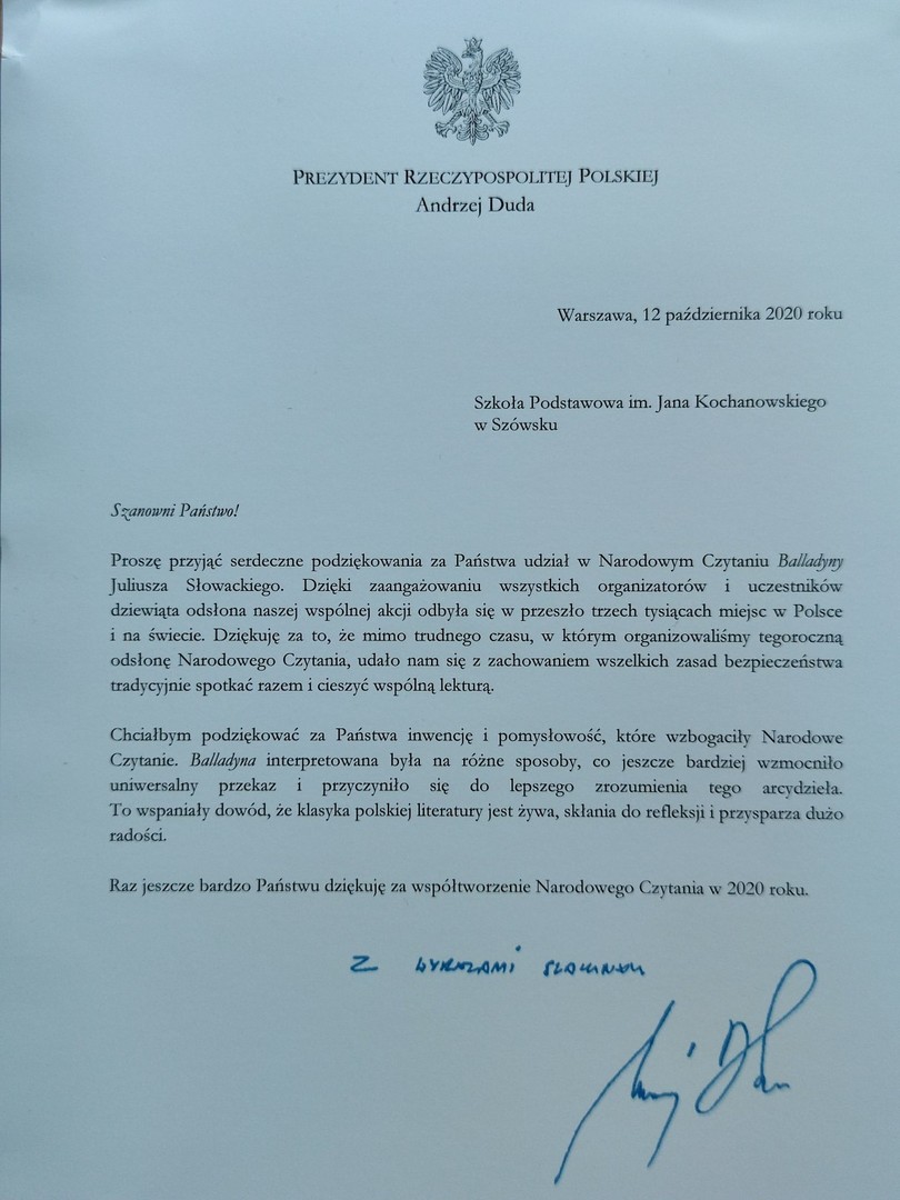 Podziękowanie Prezydenta Rzeczpospolitej Polskiej Andrzeja Dudy za udział Szkoły Podstawowej im. Jana Kochanowskiego w Szówsku w Narodowym Czytaniu Balladyny Juliusza Słowackiego.