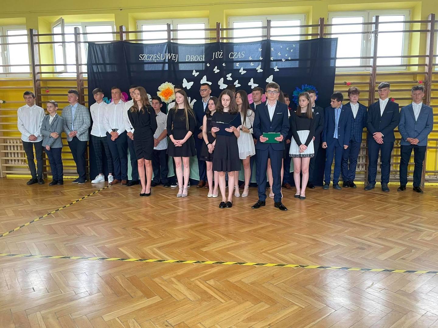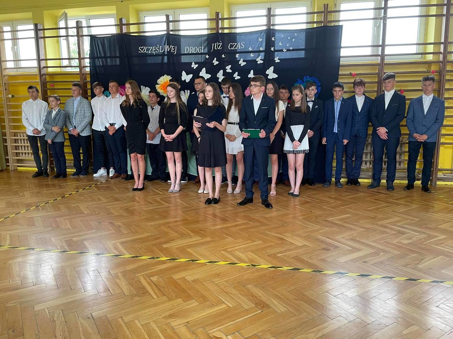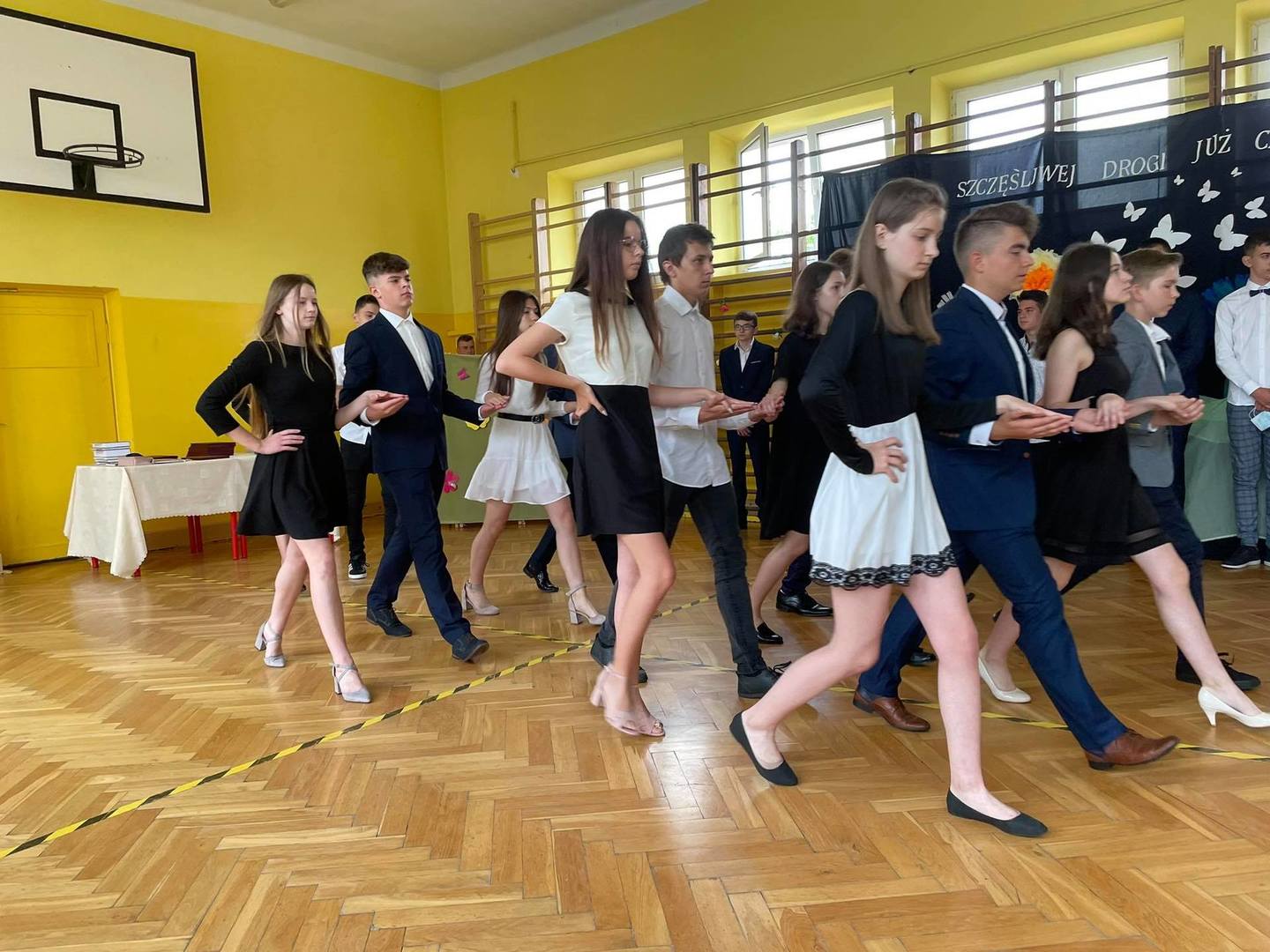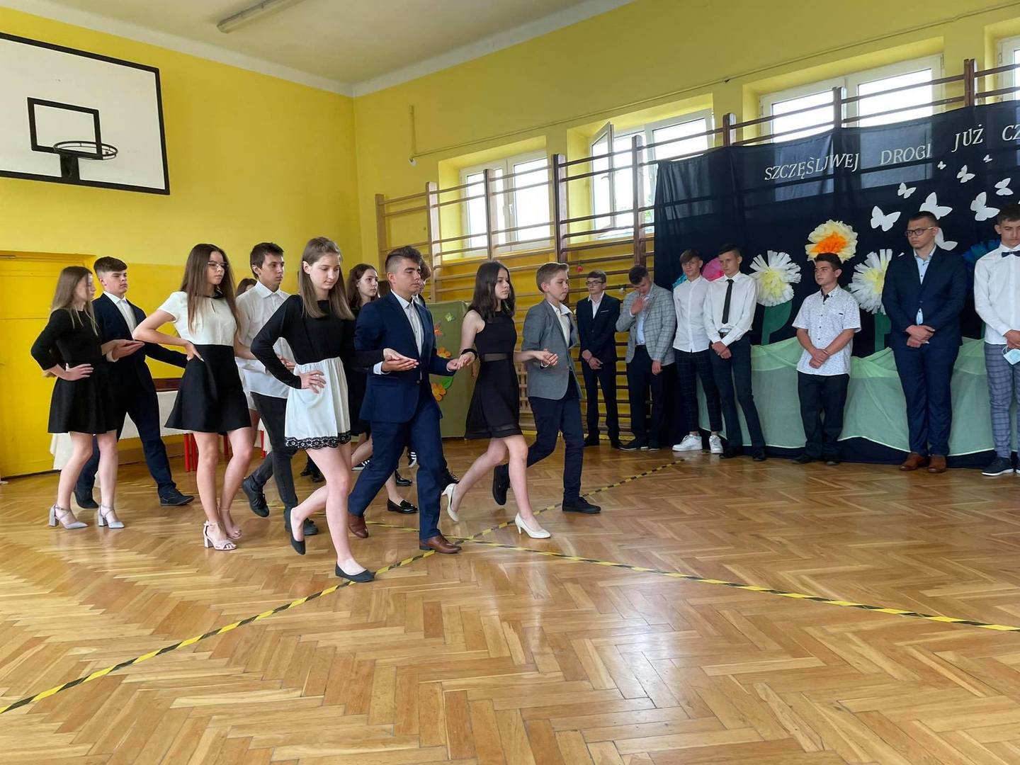 W dniu 25 czerwca 2021r. odbyło się pożegnanie uczniów klasy ósmej. W uroczystości wzięli udział: dyrekcja szkoły, nauczyciele oraz przedstawiciele Rady Rodziców. Na początku kilka ciepłych słów skierowała do uczniów Pani Dyrektor oraz wychowawczyni. Następnie absolwenci zatańczyli poloneza i zwrócili się do wszystkich uczących:
