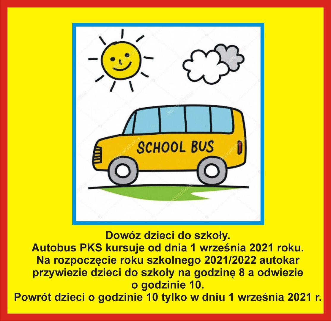 Na rozpoczęcie roku szkolnego 2021/2022 autokar przywiezie dzieci do szkoły na godzinę 8 a odwiezie o godzinie 10 (powrót dzieci o godzinie 10 tylko w dniu 1 września).