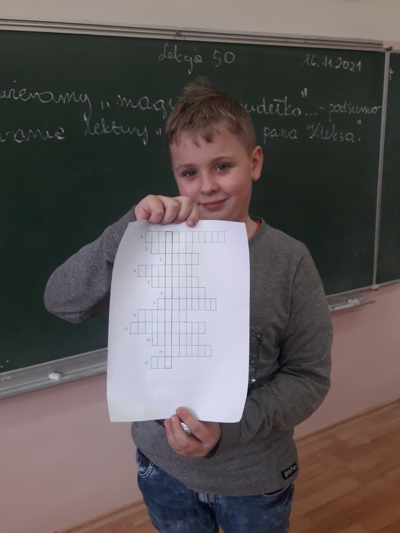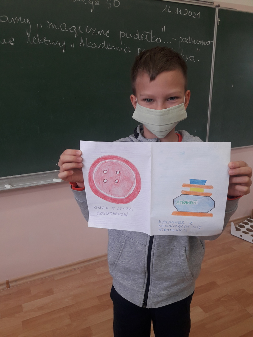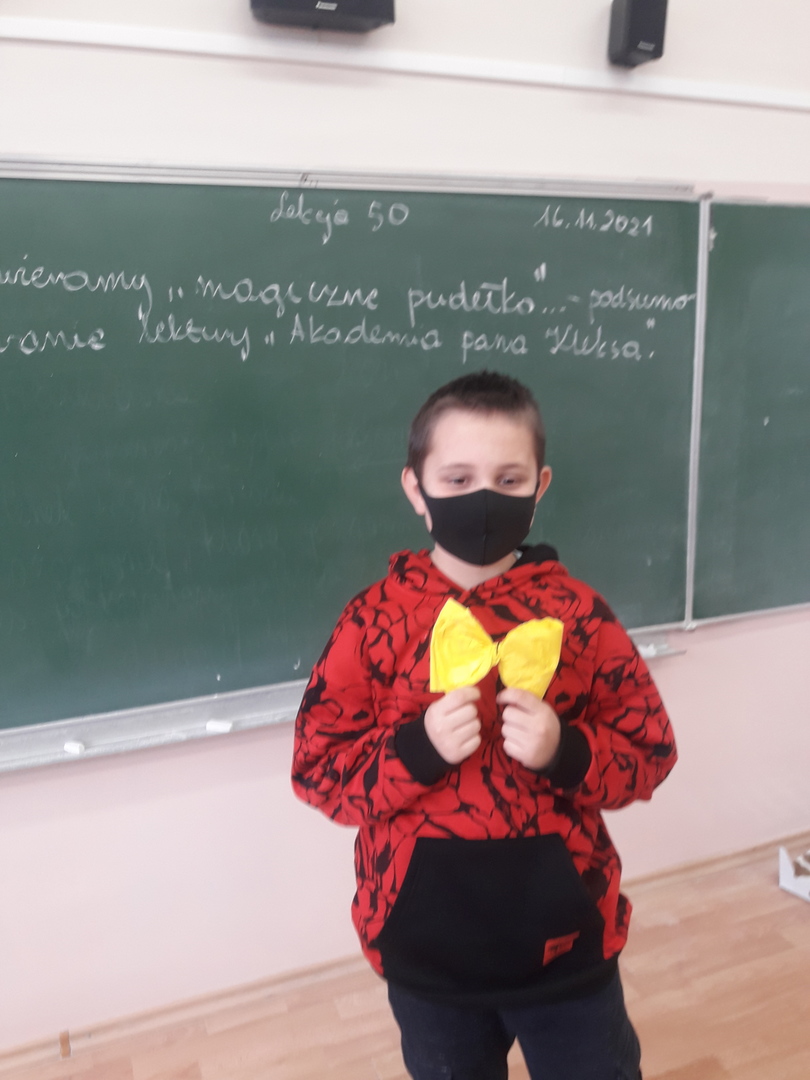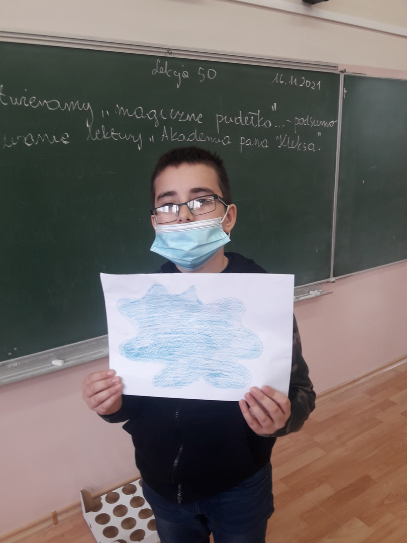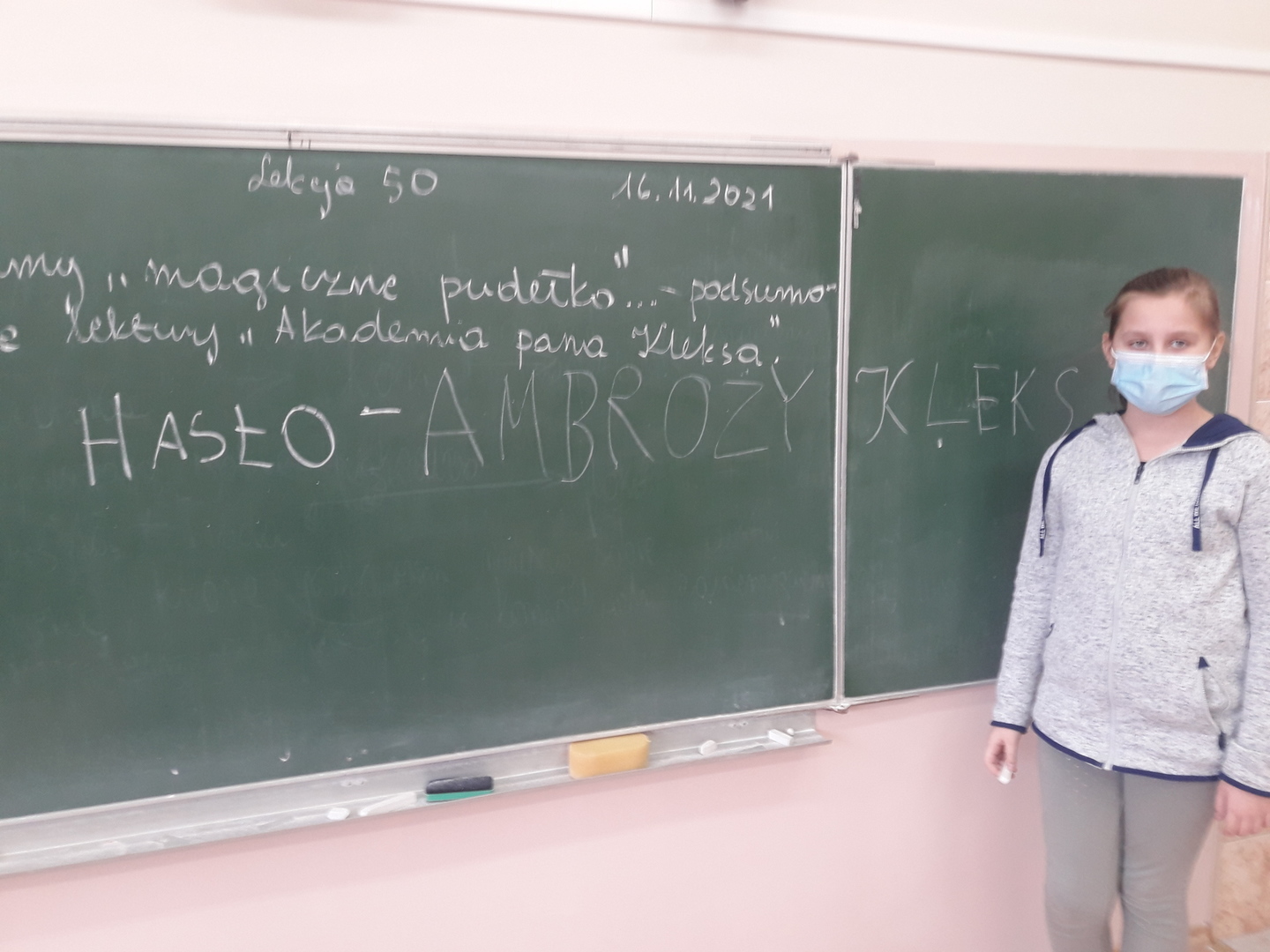 W myśl zasady, że lektura poza płaszczyzną dydaktyczną, powinna zapaść uczniom w pamięci na całe życie, klasa 4b uczestniczyła w pewnym przedsięwzięciu.Podczas omawiania "Akademii pana Kleksa" uczniowie wypełniali " magiczne pudełko" wykonanymi przez siebie przedmiotami związanymi z lekturą. Na zajęciach podsumowujących spotkanie z utworem Jana Brzechwy prezentowali przyniesione przez siebie prace. Czego w " magicznym pudełku" nie było...? -czupryna pana Kleksa , piegi, okulary, kokarda , magiczny kluczyk , czapka bogdychanów , kolorowe szkiełka, rebusy i krzyżówki .