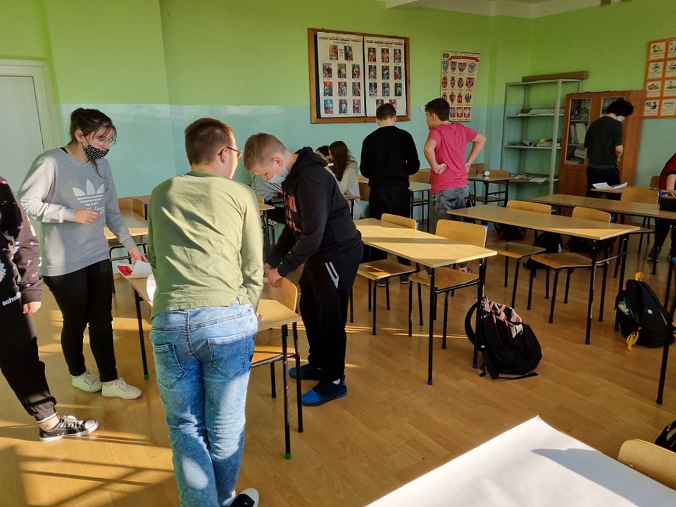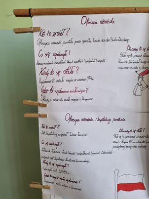 Uczniowie klas siódmych i ósmych na lekcjach historii zostali zapoznani z założeniami projektu. Następnie zostali podzieleni na cztro-, pięcioosobowe zespoły, które otrzymały tematy do opracowania i przygotowania w formie plakatu, mapy myśli lub w innej formie graficznej. W oparciu o materiały i treści przedstawione na lekcji, udostępnione przez nauczyciela oraz samodzielne poszukiwania, uczniowie indywidualnie przygotowali materiały (zdjęcia, rysunki, teksty), które wykorzystali na kolejnych zajęciach przygotowując w grupach plansze demonstrujące przedstawiające wskazane zagadnienie.