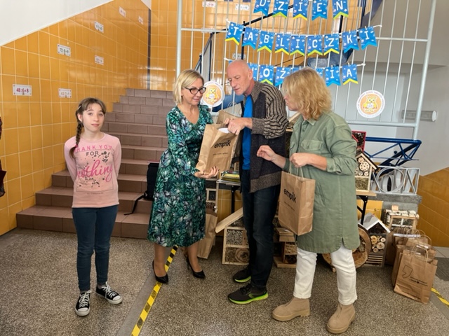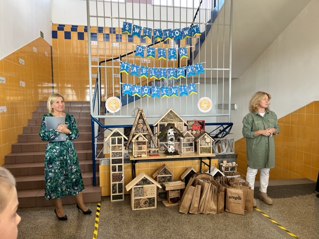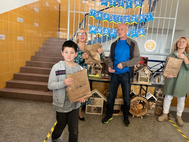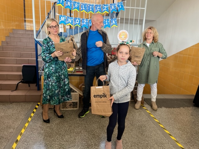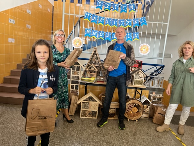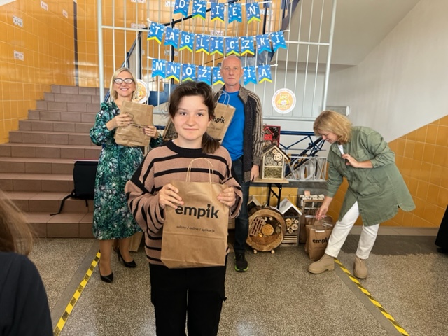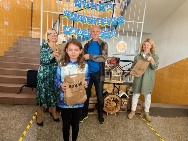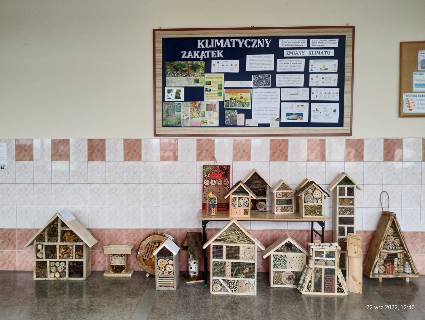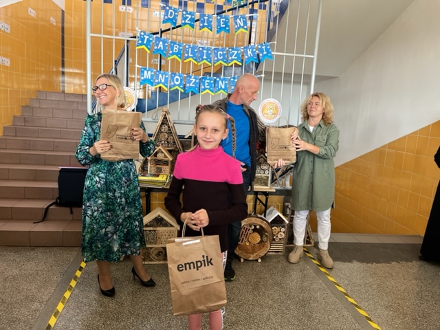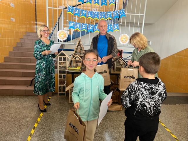 Podczas uroczystego apelu w dniu 18.10.2022 r. nagrody otrzymali uczniowie, którzy wzięli udział w szkolnym konkursie pod hasłem "Domek dla owadów" zorganizowanym w ramach projektu "Klimatyczny zakątek". Łącznie wpłynęło 18 prac - były to oryginalne i pomysłowe domki dla owadów. Uczniowie wykonywali te konkursowe prace z pomocą rodziców - co niewątpliwie przyczyniło się do umocnienia rodzinnych więzi oraz było ciekawą formą wspólnego spędzania wolnego czasu. Konkurs cieszył się dużym zainteresowaniem, ponieważ zachęcał do aktywności, promował kreatywność, pomysłowość oraz twórcze działania dzieci i młodzieży. Celem konkursu było między innymi: pogłębienie zamiłowania oraz szacunku dla przyrody; zwrócenie uwagi na problem wymierania dziko żyjących owadów, zwłaszcza zapylających; pogłębianie wiedzy na temat ochrony środowiska z wykorzystaniem recyklingu; umacnianie relacji rodzinnych podczas wspólnych działań dla dobra środowiska; rozwijanie zainteresowań oraz uzdolnień uczniów.