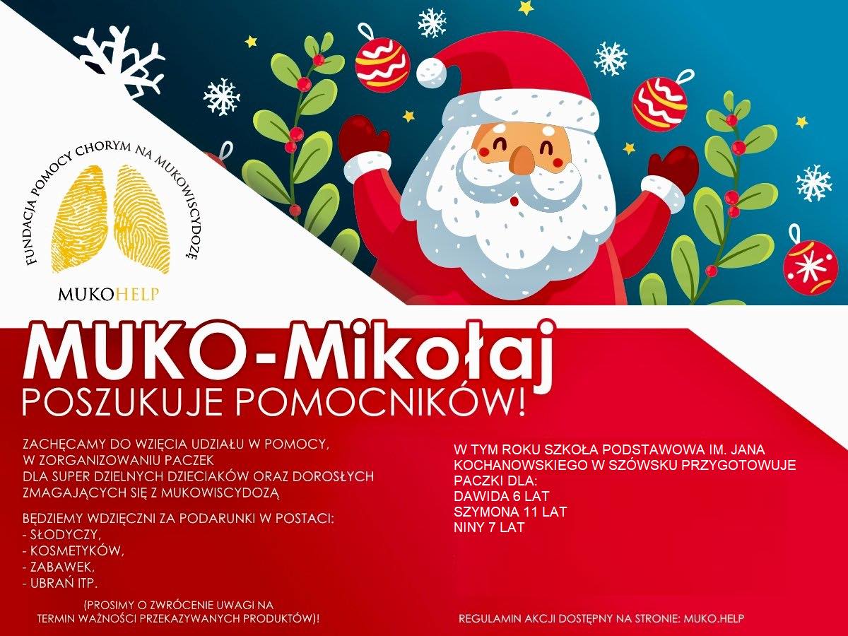 Koordynatorami akcji „To Ty bądź naszym Świętym Mikołajem” i „Muko-Mikołaj” jest psycholog Ewelina Gołąb i pedagog Katarzyna Ryznar. Prosimy o przynoszenie prezentów do 21.11.2022 r. do gabinetu psychologa/pedagoga. Zachęcamy do udziału w akcji wszystkich uczniów, rodziców i nauczycieli.