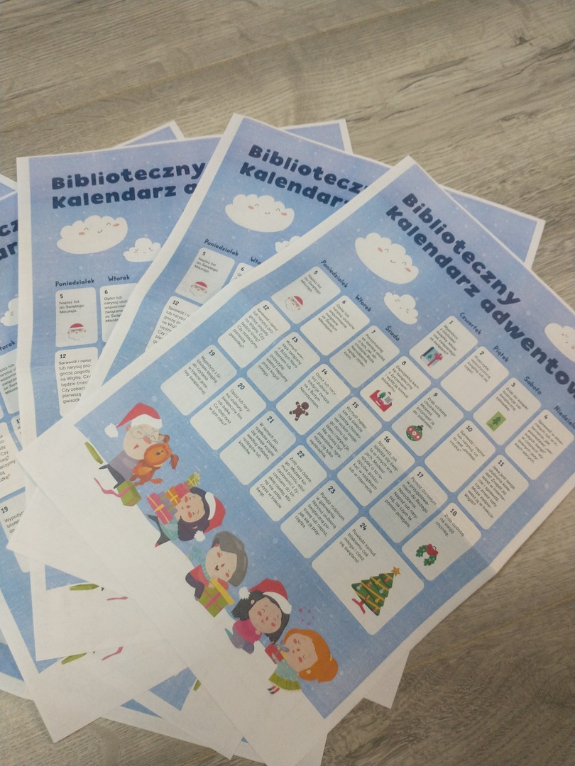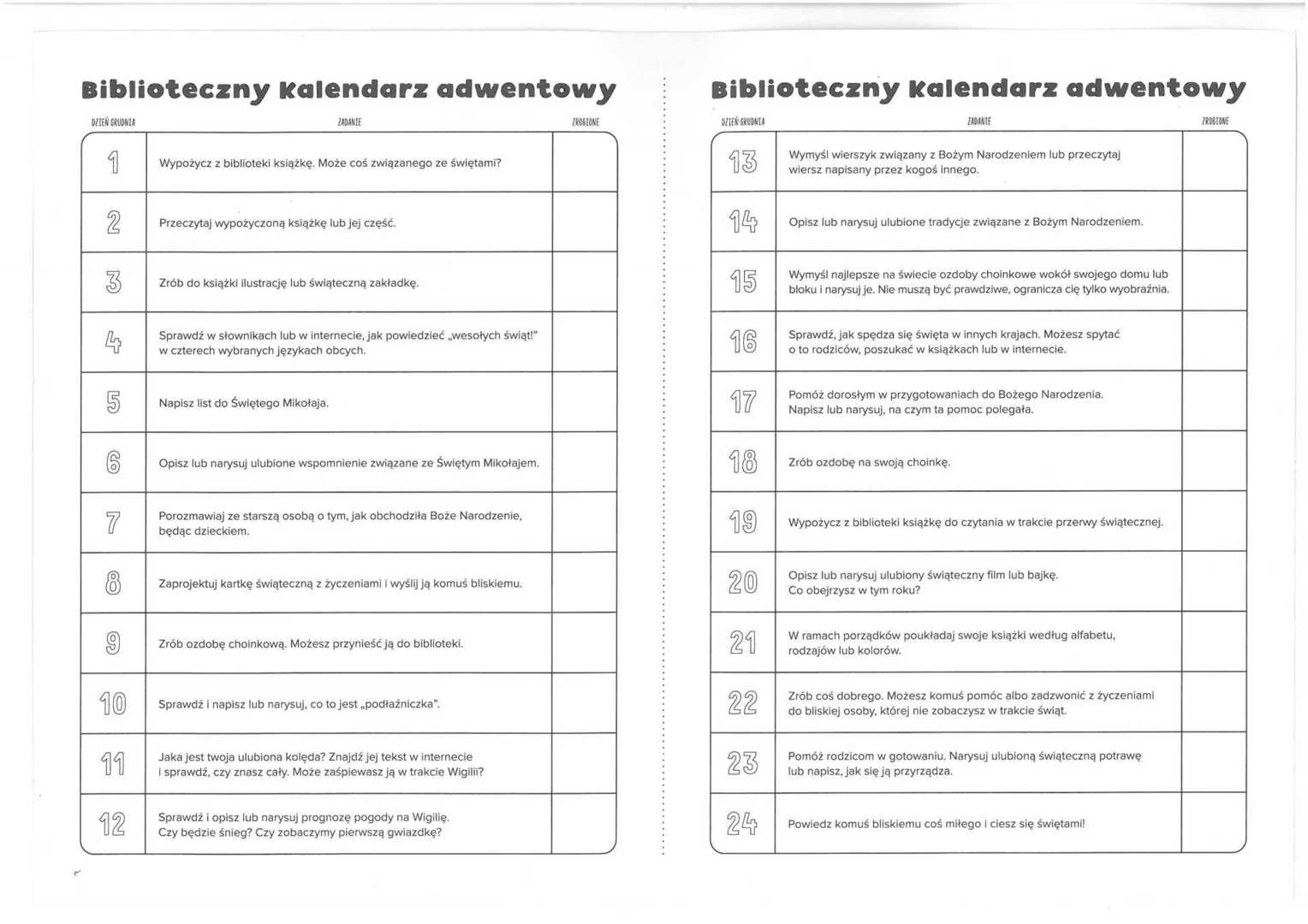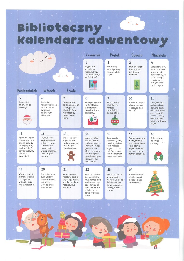 Grudzień to czas radosnego oczekiwania. Wszystkich chętnych Czytelników zapraszamy do biblioteki, gdzie od 1 grudnia będzie można otrzymać biblioteczny kalendarz adwentowy z ciekawymi propozycjami na każdy dzień grudnia. Niech ta zabawa umili wszystkim odwiedzającym nasza bibliotekę okres przygotowania do Świąt Bożego Narodzenia. Do zobaczenia w bibliotece! Ps. dziękuję wszystkim „Elfom” za pozalekcyjną pomoc w bibliotece, m.in. w przygotowaniu wspomnianego kalendarza