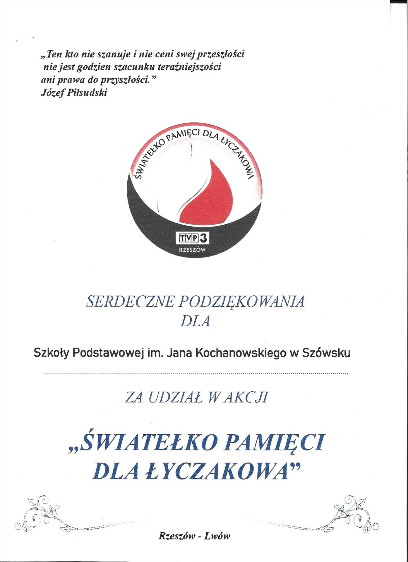 W imieniu organizatorów akcji składamy serdeczne podziękowania uczniom naszej szkoły za zebrane biało-czerwone znicze oraz Rodzicom za ich zakup. Słowa podziękowania kierujemy również do komendanta OSP KSRG Sieniawa pana Eryka Ceglaka oraz druhów z podległej mu jednostki tj. druhny Agnieszki oraz druha Eryka, którzy odebrali zebrane przez nas znicze i dostarczyli je do siedziby Telewizji Polskiej w Rzeszowie.