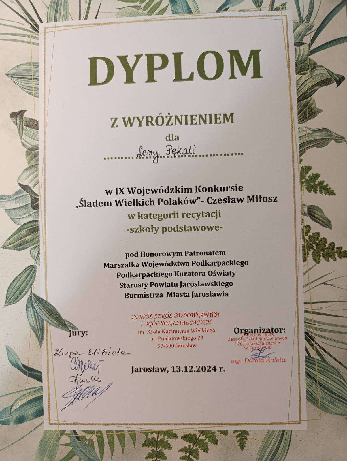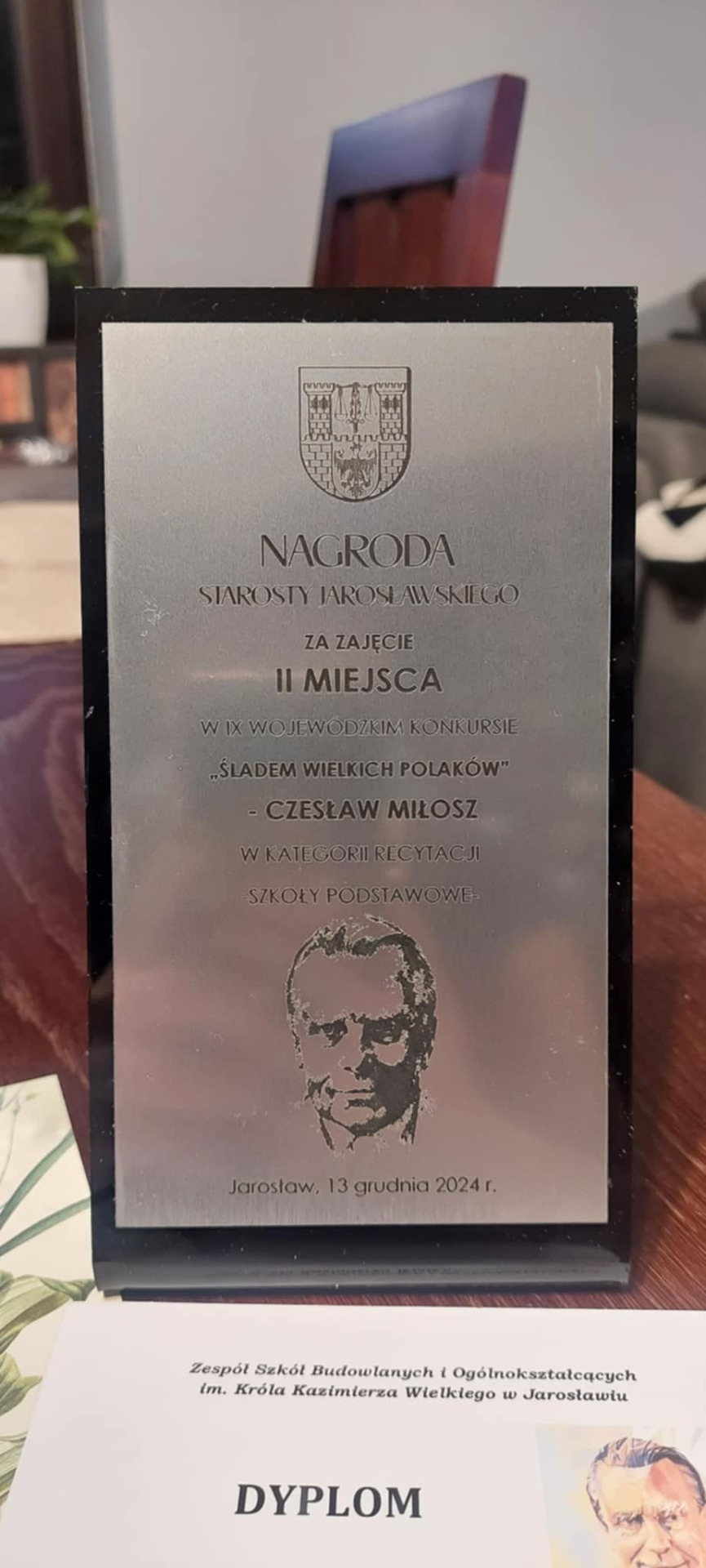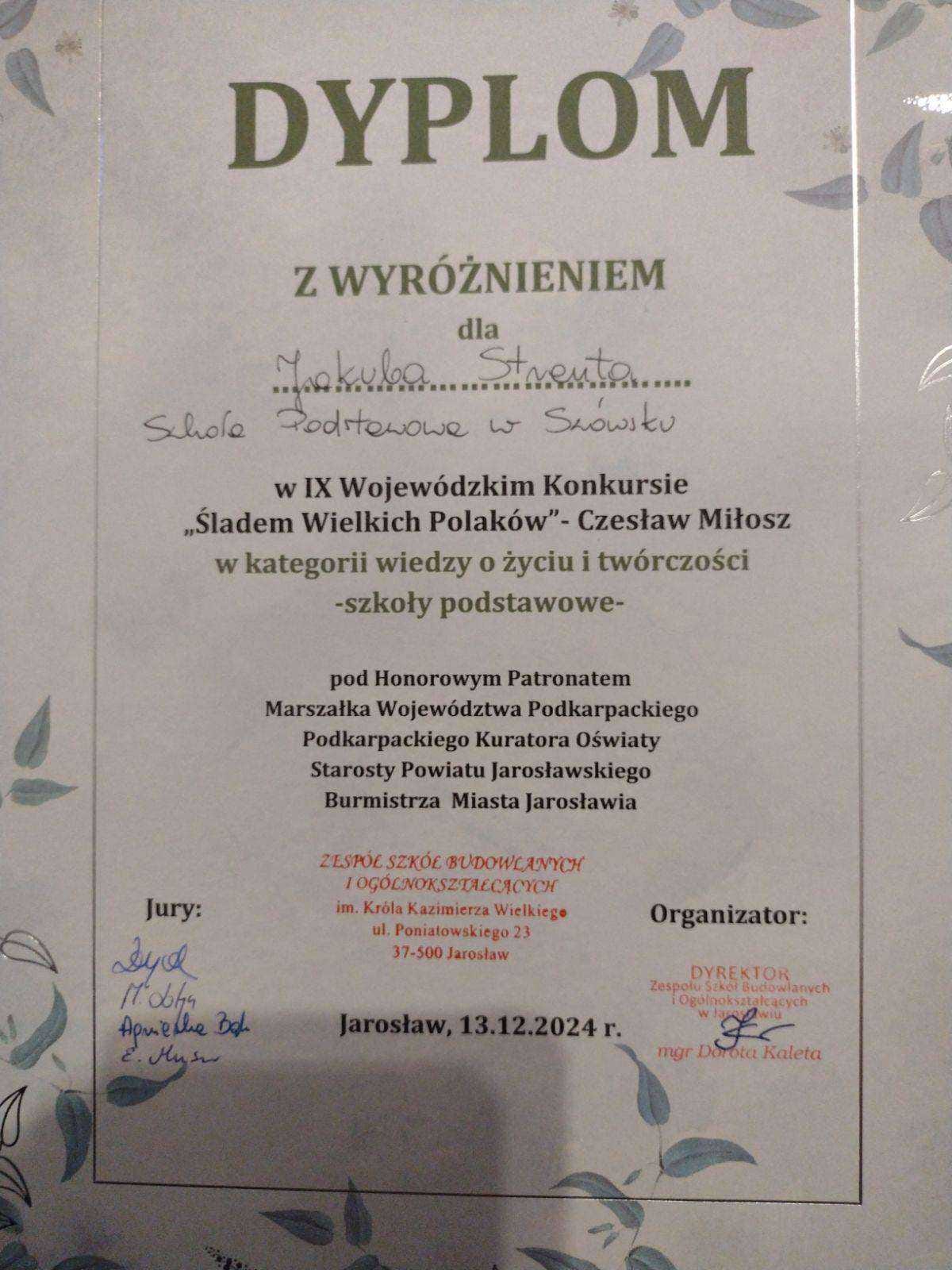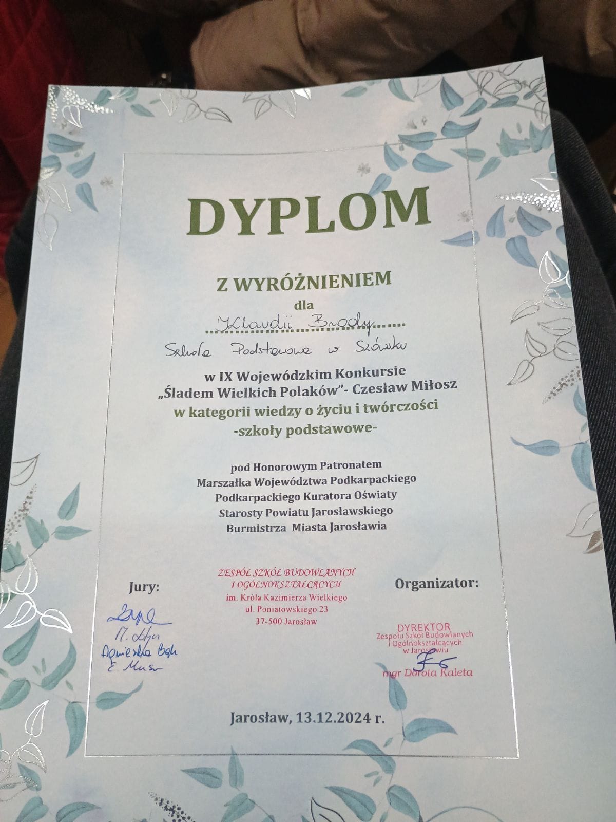 13.12.2024 roku uczniowie naszej szkoły, po wygraniu szkolnych eliminacji, udali się na finał IX Wojewódzkiego Konkursu "Śladami Wielkich Polaków " -Czesław Miłosz.