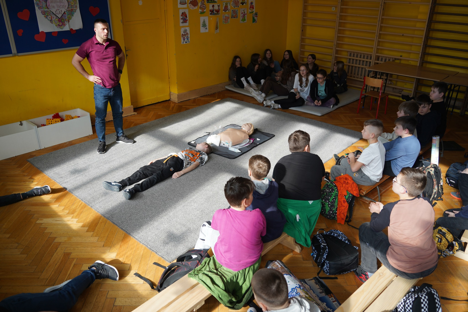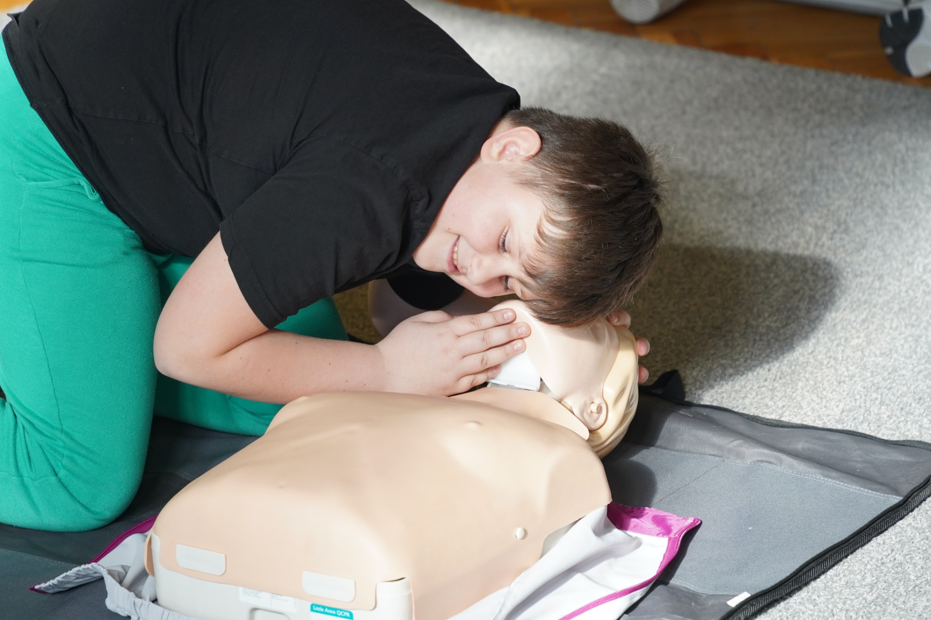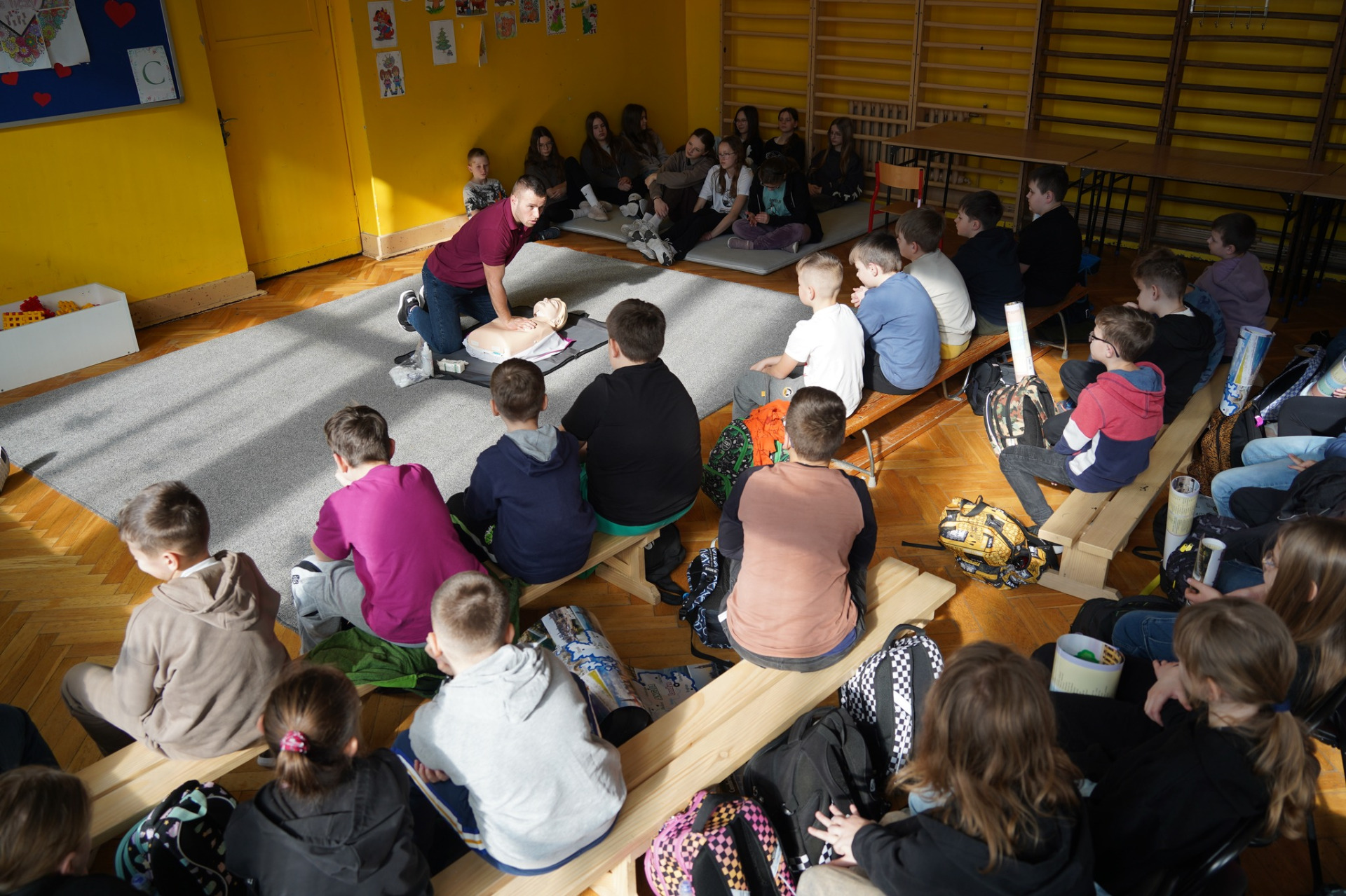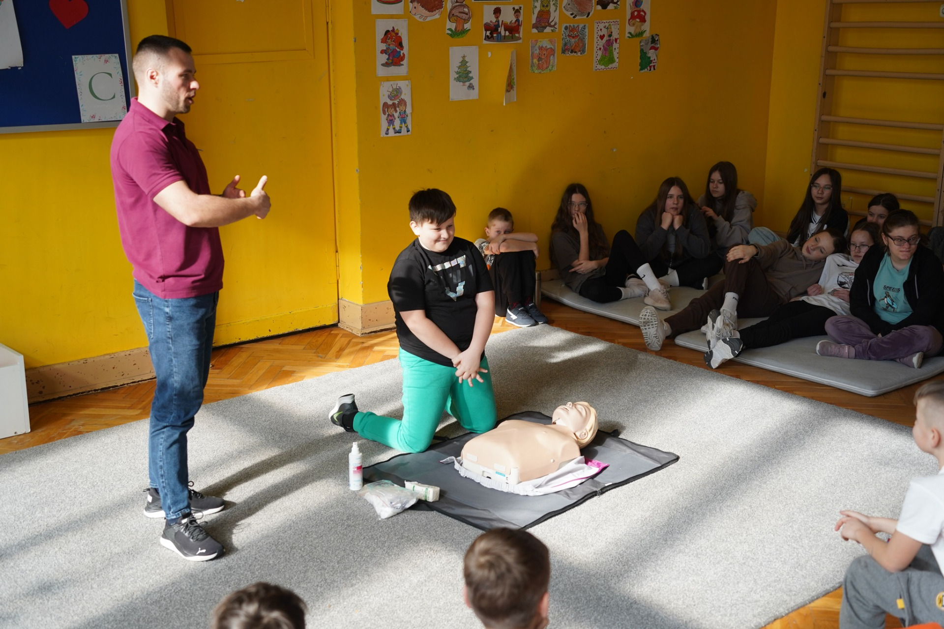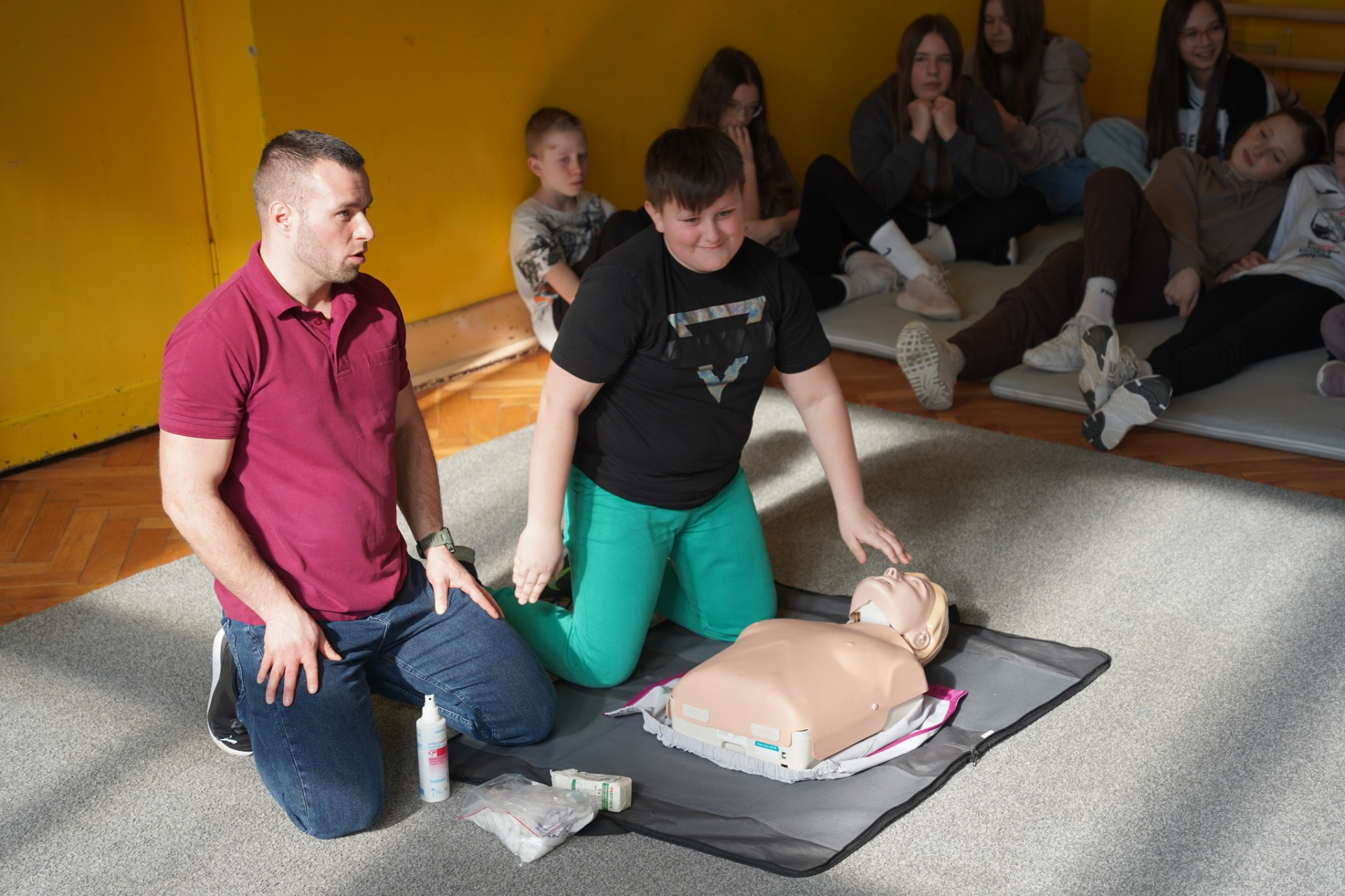 Zajęcia miały interaktywny charakter – dzieci mogły ćwiczyć RKO na fantomie oraz ułożenie poszkodowanego w pozycji bezpiecznej. Warsztaty spotkały się z dużym zainteresowaniem i zaangażowaniem uczniów, którzy chętnie brali udział w ćwiczeniach praktycznych.