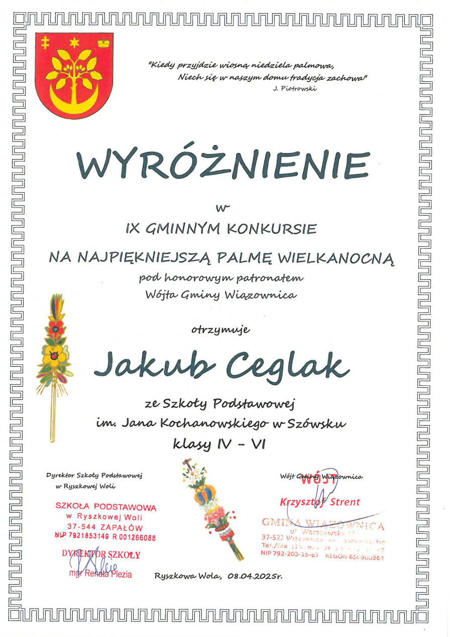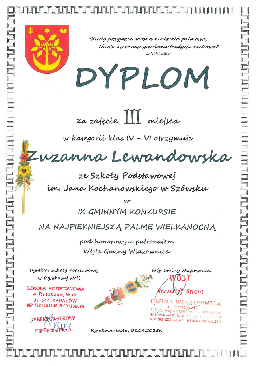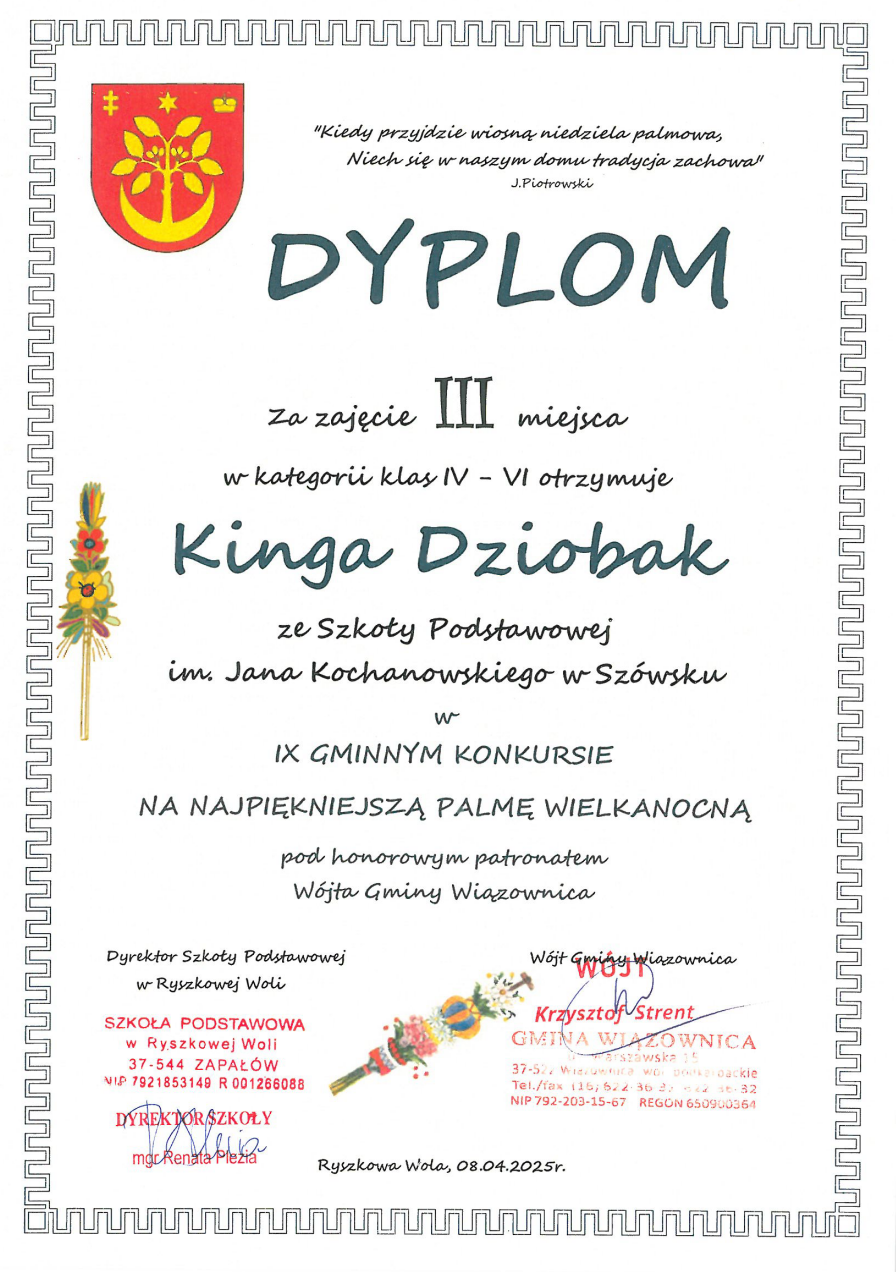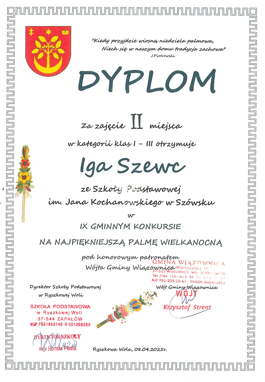 IX GMINNY KONKURS NA NAJPIĘKNIEJSZĄ PALMĘ WIELKANOCNĄ pod honorowym patronatem Wójta Gminy Wiązownica. Jakub Ceglak otrzymał wyróżnienie, Zuzanna Lewandowska i Kinga Dziobak zajęły III miejsce w kategorii klas IV - VI, Iga Szewc w kategorii klas I - III zajęła II miejsce.