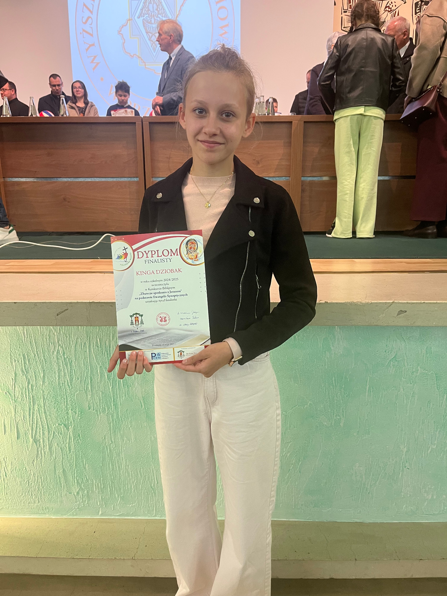 Kinga Dziobak, która osiągnęła niebywały sukces - znalazła się w gronie finalistów! Kinga w marcu br. na etapie dekanalnym zajęła I miejsce, wykazując się najlepszą znajomością Ewangelii wg św. Marka oraz Ewangelii wg św. Mateusza. Tym razem - na etapie dekanalnym, wykazała się bardzo dobrą znajomością Ewangelii i komentarzy do fragmentów Biblii. Do konkursu przygotowywała się pod czujnym okiem naszego proboszcza ks. Andrzeja Więcka.