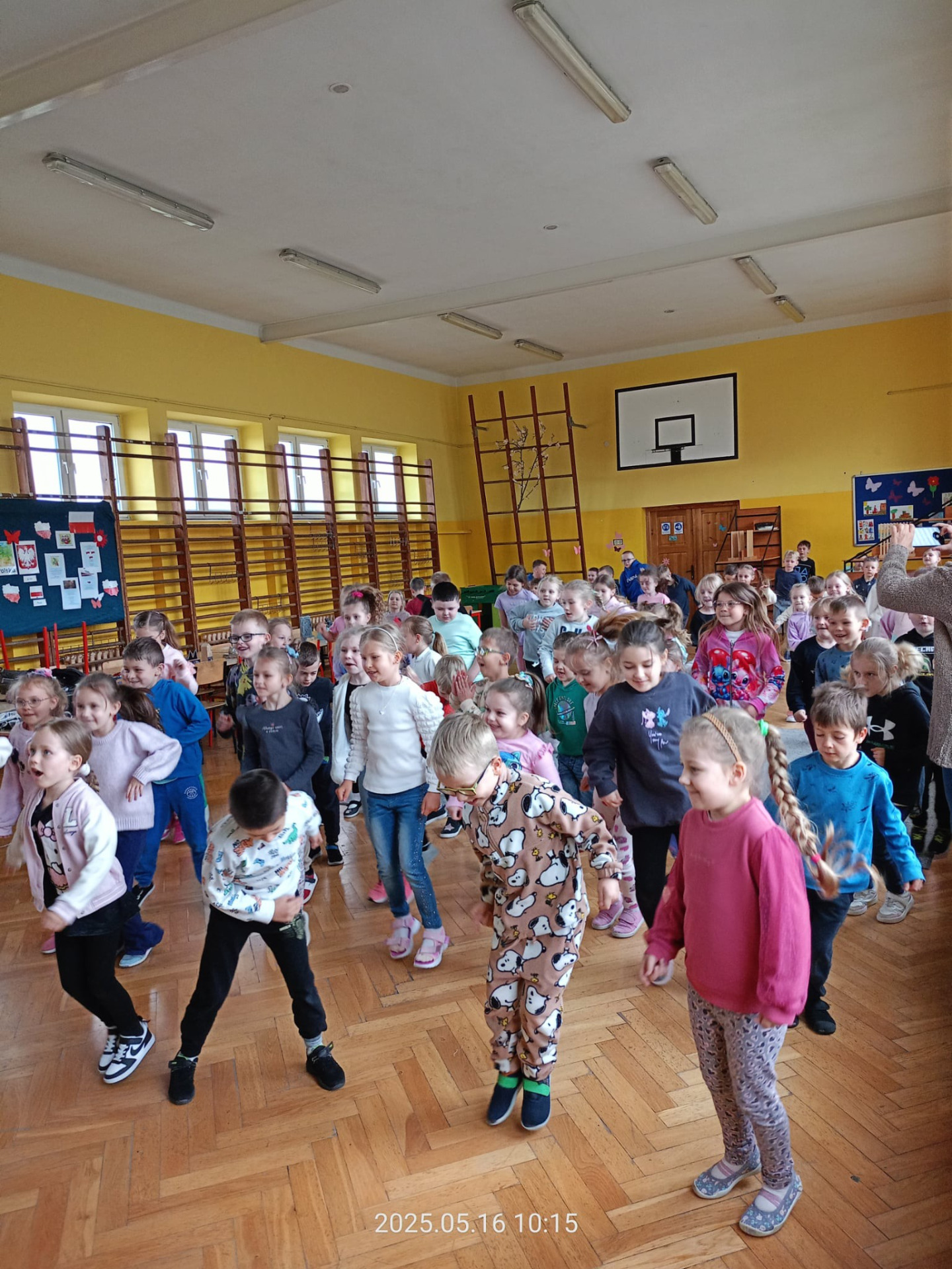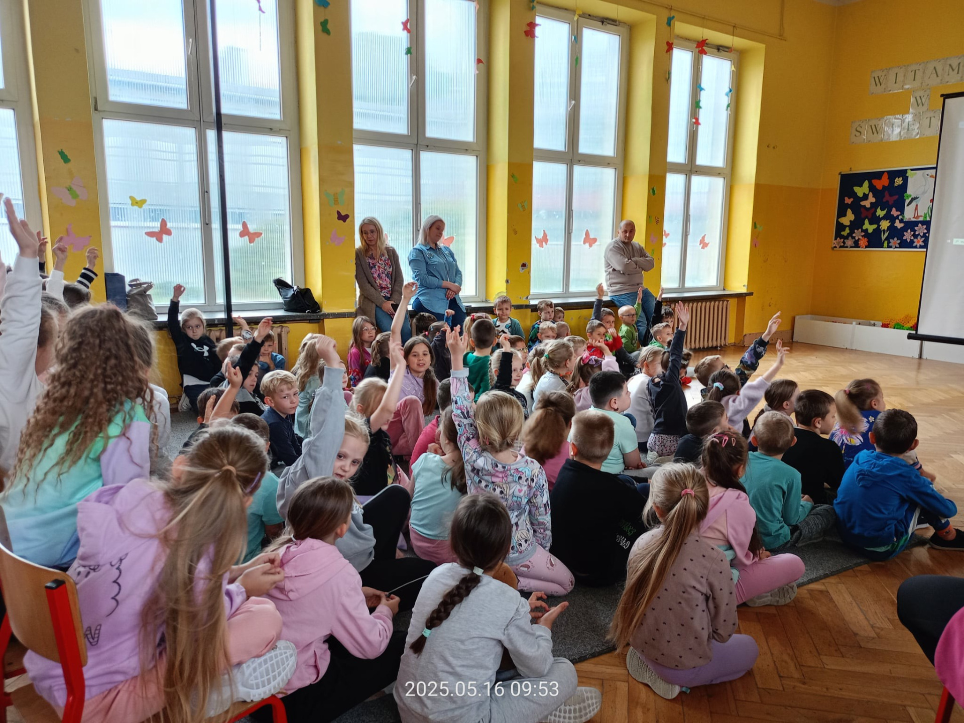 Miłym akcentem była lekcja wychowania fizycznego, którą nasz gość poprowadził z uczniami klasy 1a. Był to czas pełen ruchu, uśmiechu i pozytywnej energii, który na długo pozostanie w pamięci najmłodszych. Nie zabrakło wielu pytań skierowanych do naszego gościa.