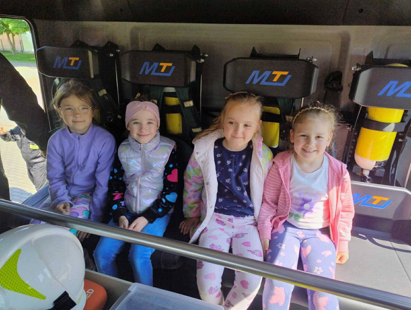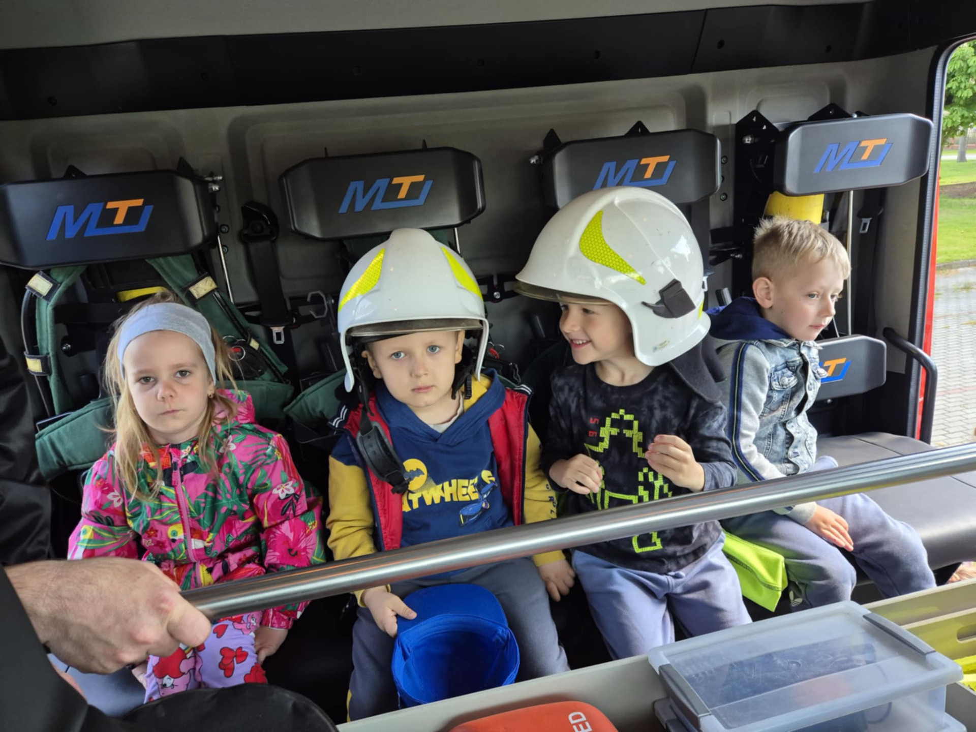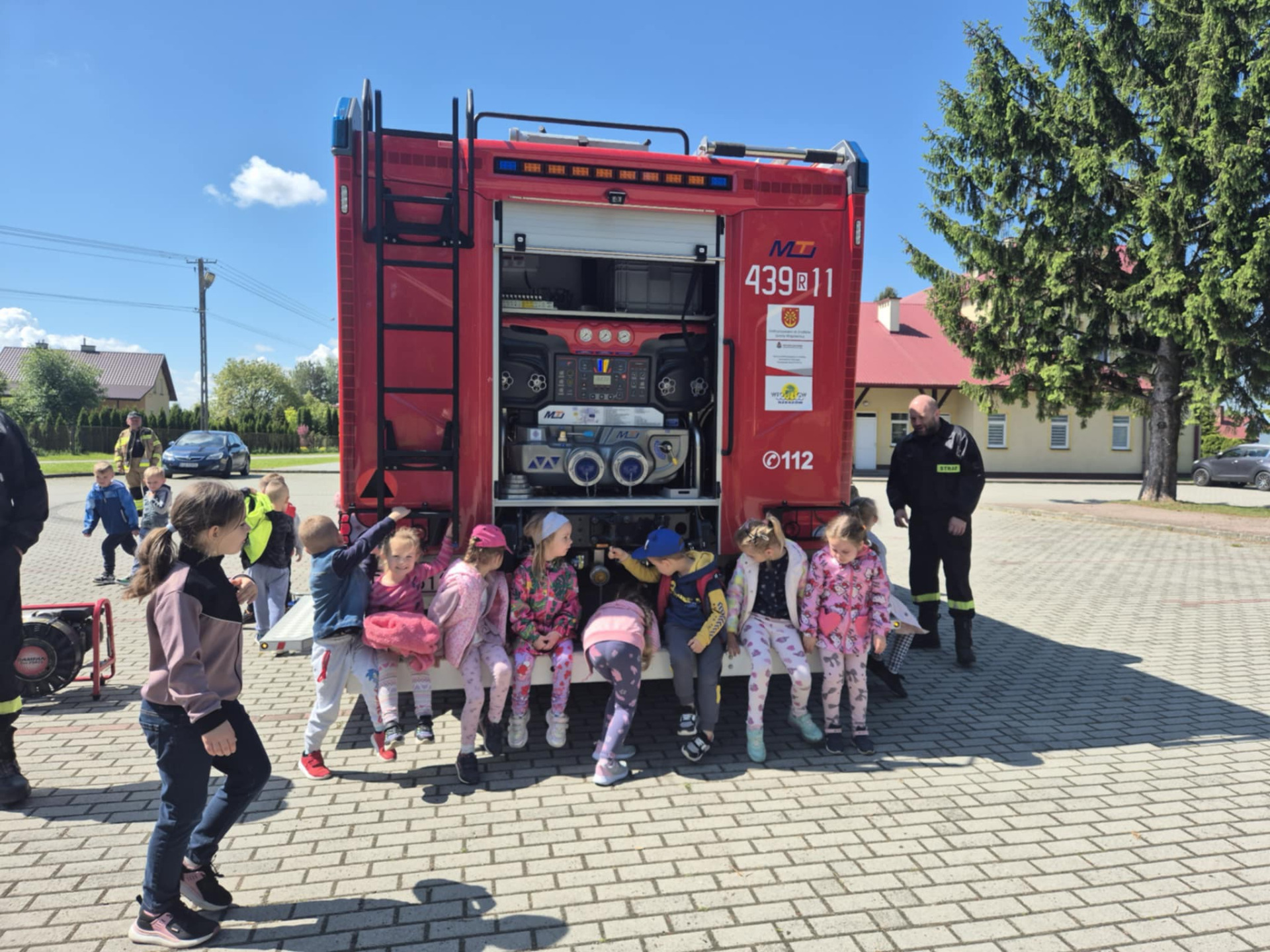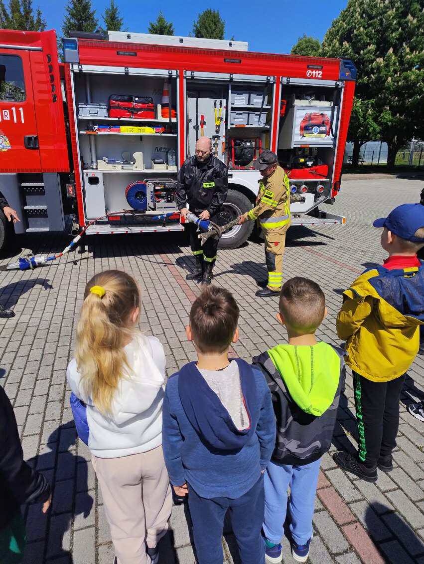 Ogromną atrakcją było przymierzanie strażackiego hełmu oraz możliwość obejrzenia z bliska wozu strażackiego i specjalistycznego sprzętu: gaśnic, węży, narzędzi ratowniczych. Dzieci były zachwycone i pełne podziwu dla pracy strażaków.