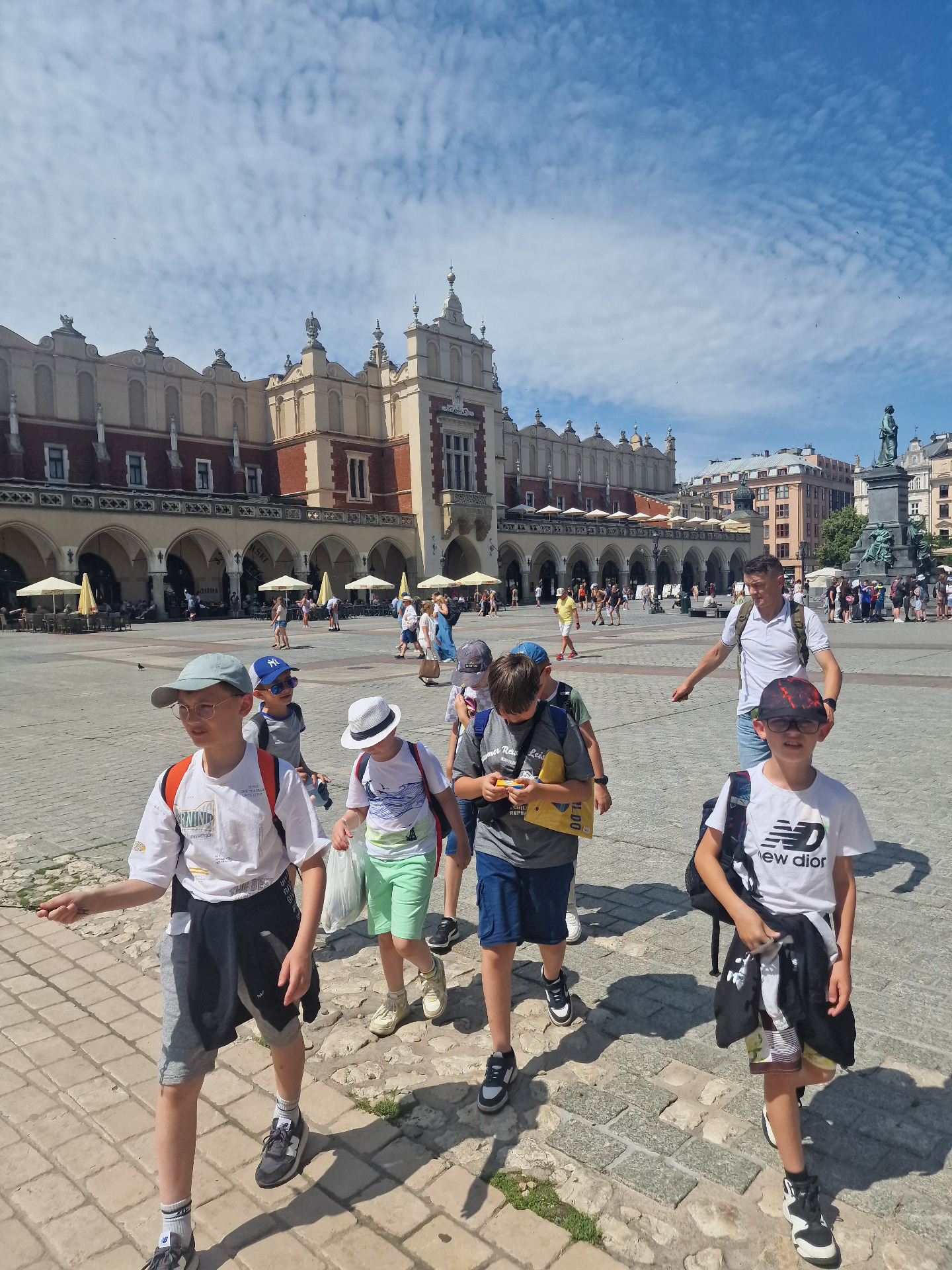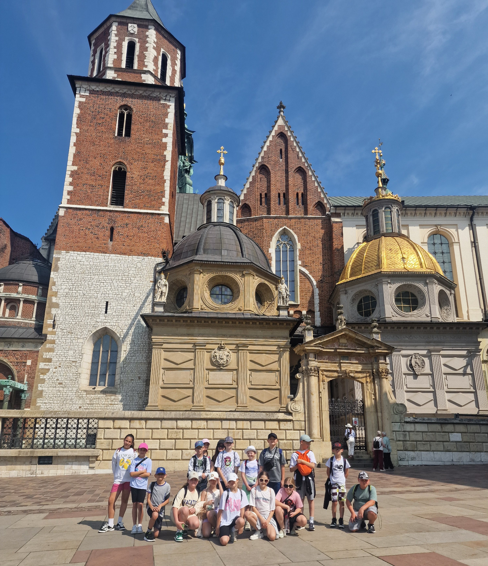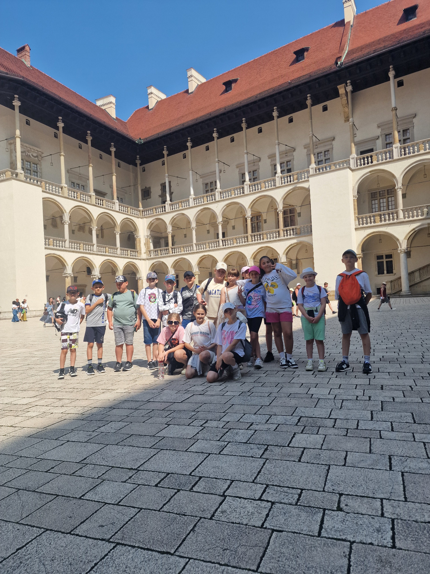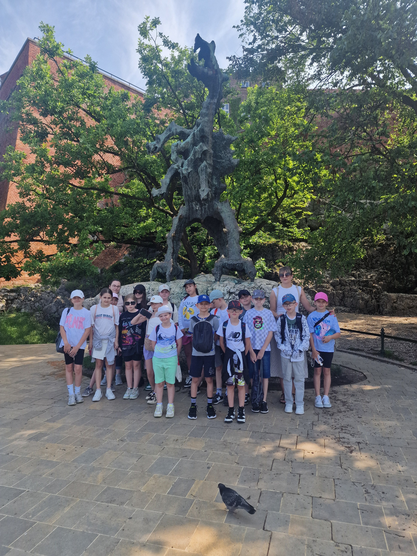 Pierwszym punktem programu było zwiedzanie Wawelu - dawnej siedziby królów polskich. Następnie uczestnicy wycieczki udali się do Kościoła Mariackiego, gdzie z zachwytem podziwiali słynny ołtarz Wita Stwosza. W samo południe na rynku krakowskim rozbrzmiał hejnał mariacki, który przypomniał o zbliżającym się obiedzie. Kolejnym przystankiem były Sukiennice – historyczna hala targowa w sercu krakowskiego Rynku, gdzie dzieci mogły przyjrzeć się pracy krakowskich rzemieślników oraz zakupić pamiątki. Ten punkt wycieczki okazał się najbardziej pożądany. Zabawki w rękach uczniów dostarczyły im ukojenia i radości z wyjazdu. Nie zabrakło też czasu na wspólne zdjęcia, pyszne lody i zabawę. Miejscem tych zabaw okazał się Ogród Doświadczeń im. Stanisława Lema. Dzieci mogły samodzielnie eksperymentować, poznawać prawa fizyki w praktyce i bawić na świeżym powietrzu wśród licznych atrakcji. Wycieczka dostarczyła wszystkim wielu wrażeń i na długo pozostanie w pamięci jako dzień pełen nauki, śmiechu i wspólnych przeżyć.