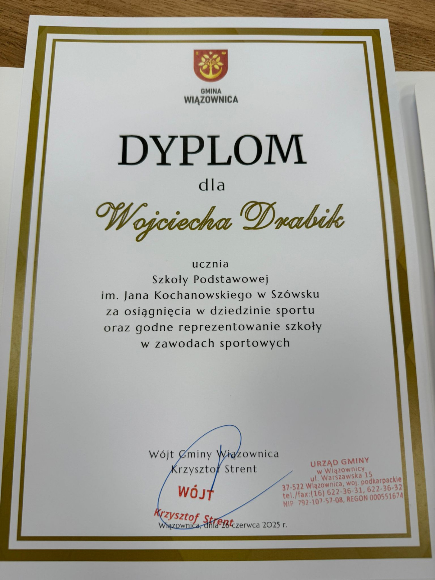 26.06.25r. w Urzędzie Gminy Wiązownica Wójt Krzysztof Strent uhonorował najlepszych sportowców ze szkół podstawowych gminy Wiązownica. Z uczniów SP Szówsko nagrodę otrzymał Wojciech Drabik, który przez cały rok szkolny wyróżniał się osiągnięciami sportowymi, zaangażowaniem oraz postawą fair play. Gratulujemy i życzymy dalszych sukcesów.