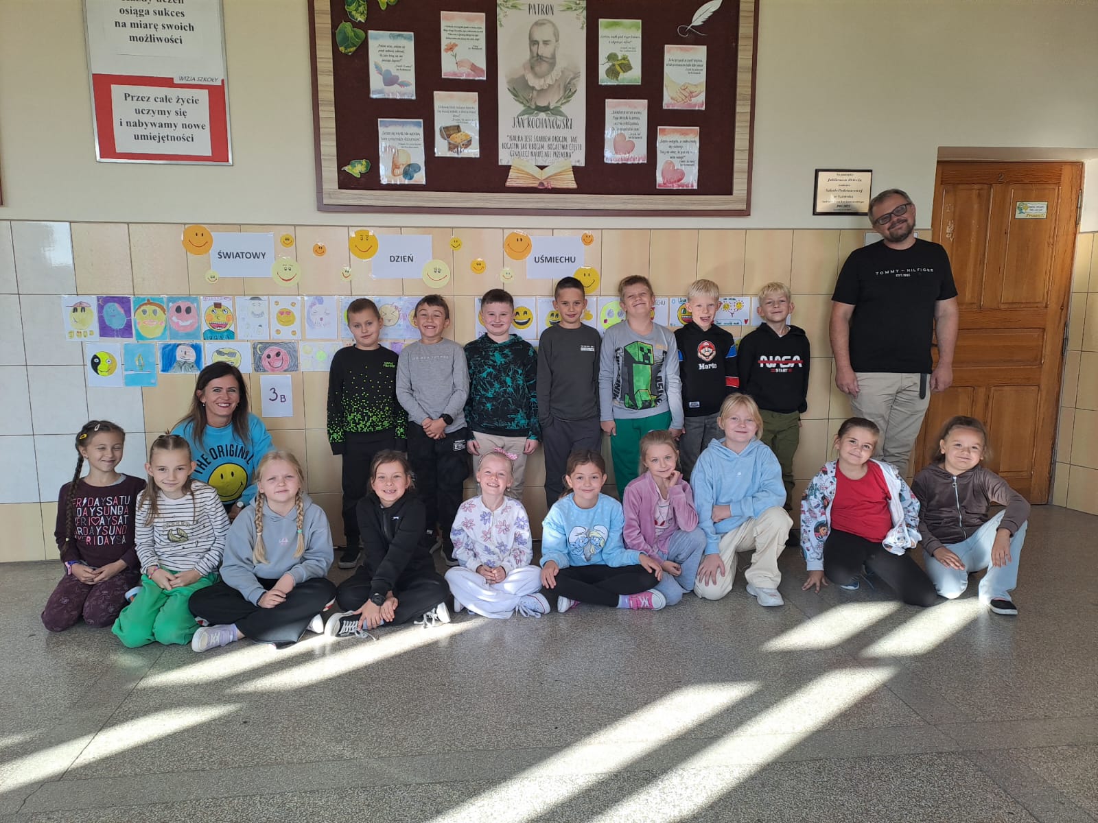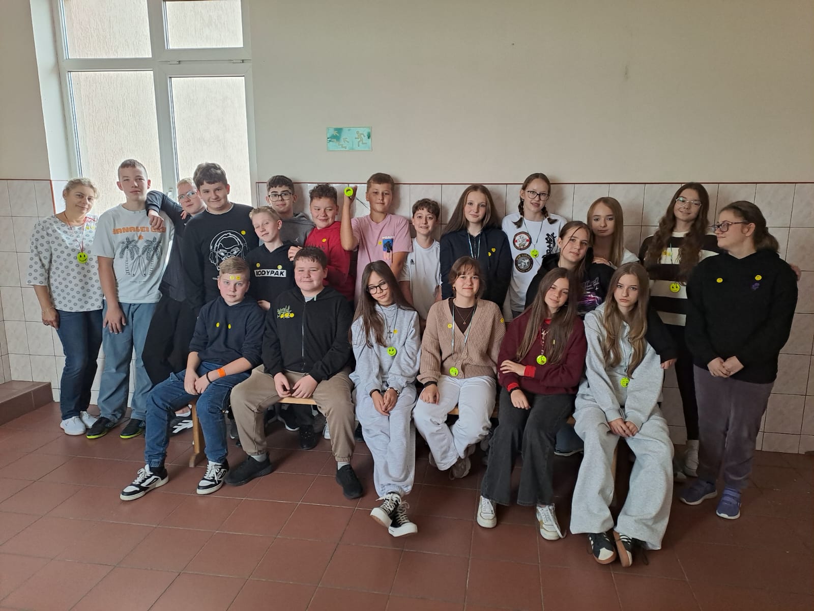 W dniu 3 października w naszej szkole obchodzony był Światowy Dzień Uśmiechu. Podczas tego dnia starsi uczniowie z klas 4-8 dowiadywali się z plakatów rozwieszonych po szkole jak pozytywnie na nas i nasze zdrowie wpływa uśmiech, który nic nas nie kosztuje, a może przynieść wiele korzyści. Uczniowie z klasy 7a przez cały dzień na przerwach naklejali rodzicom, uczniom i wszystkim pracownikom szkoły „uśmiechnięte buźki”.