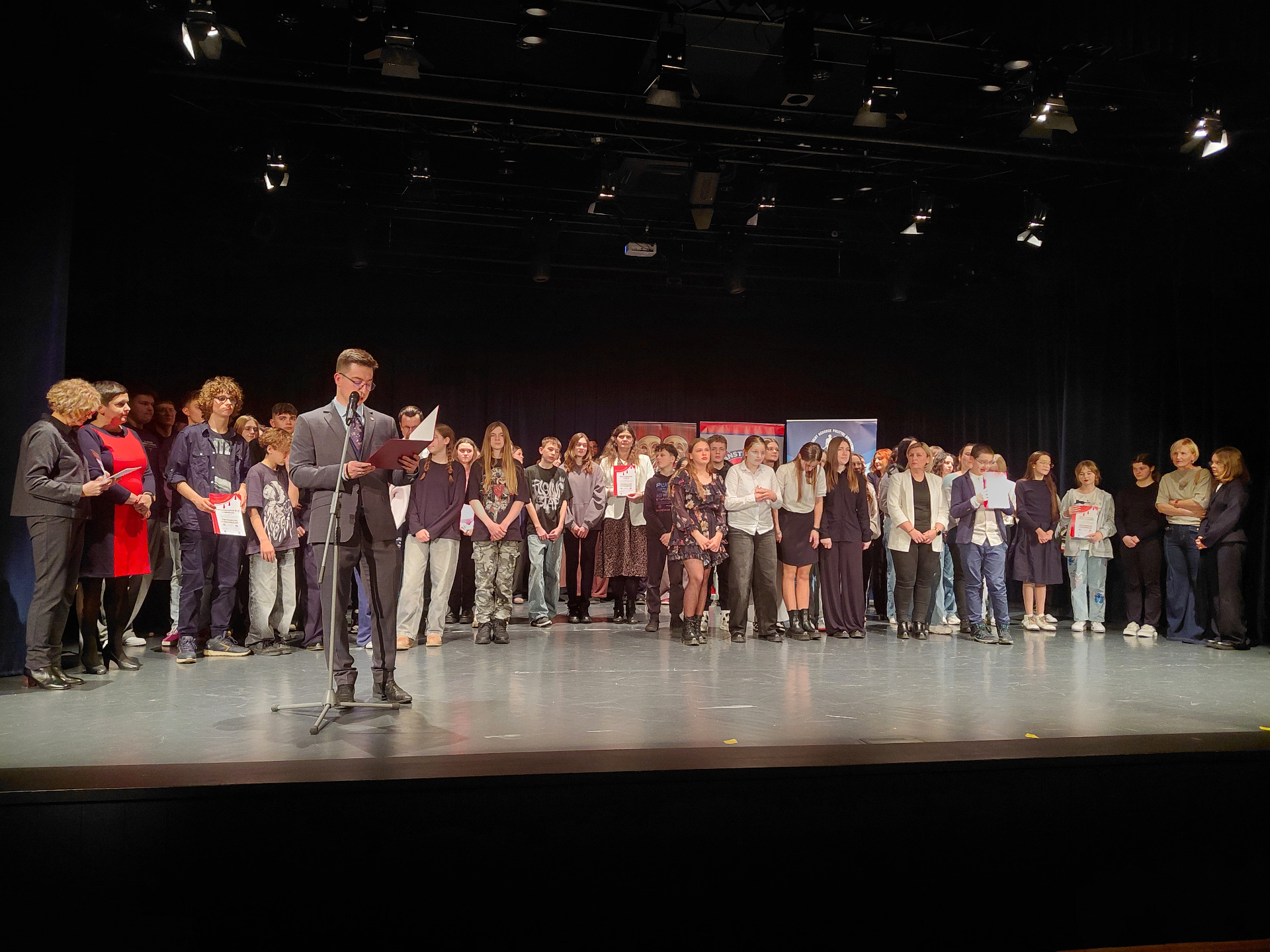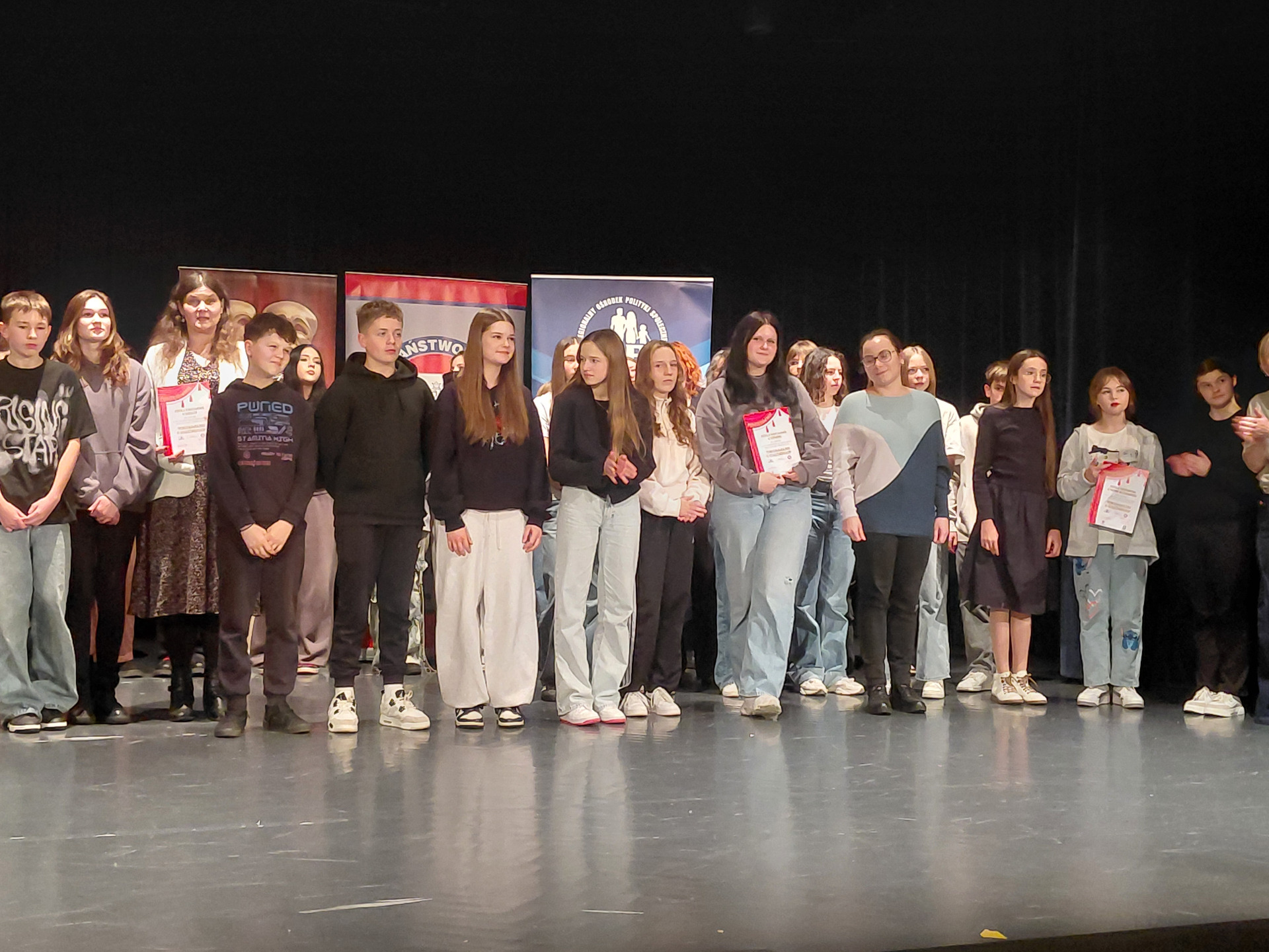 26 listopada nasi uczniowie po raz kolejny reprezentowali szkołę w XVI Wojewódzkim Przeglądzie Małych Form Teatralnych "Porozmawiajmy o uzależnieniach". Ósmoklasiści opowiedzieli historię o młodych ludziach uzależnionych od różnych technologii - telefonu czy komputera oraz jak małe kroki potrafią wiele zmienić. Przedstawienie poruszyło ważny współczesny problem i podjęło próbę przeciwdziałania uzależnieniu. Gratulujemy naszym młodym aktorom pięknego i wymownego występu oraz życzymy dalszych sukcesów.
