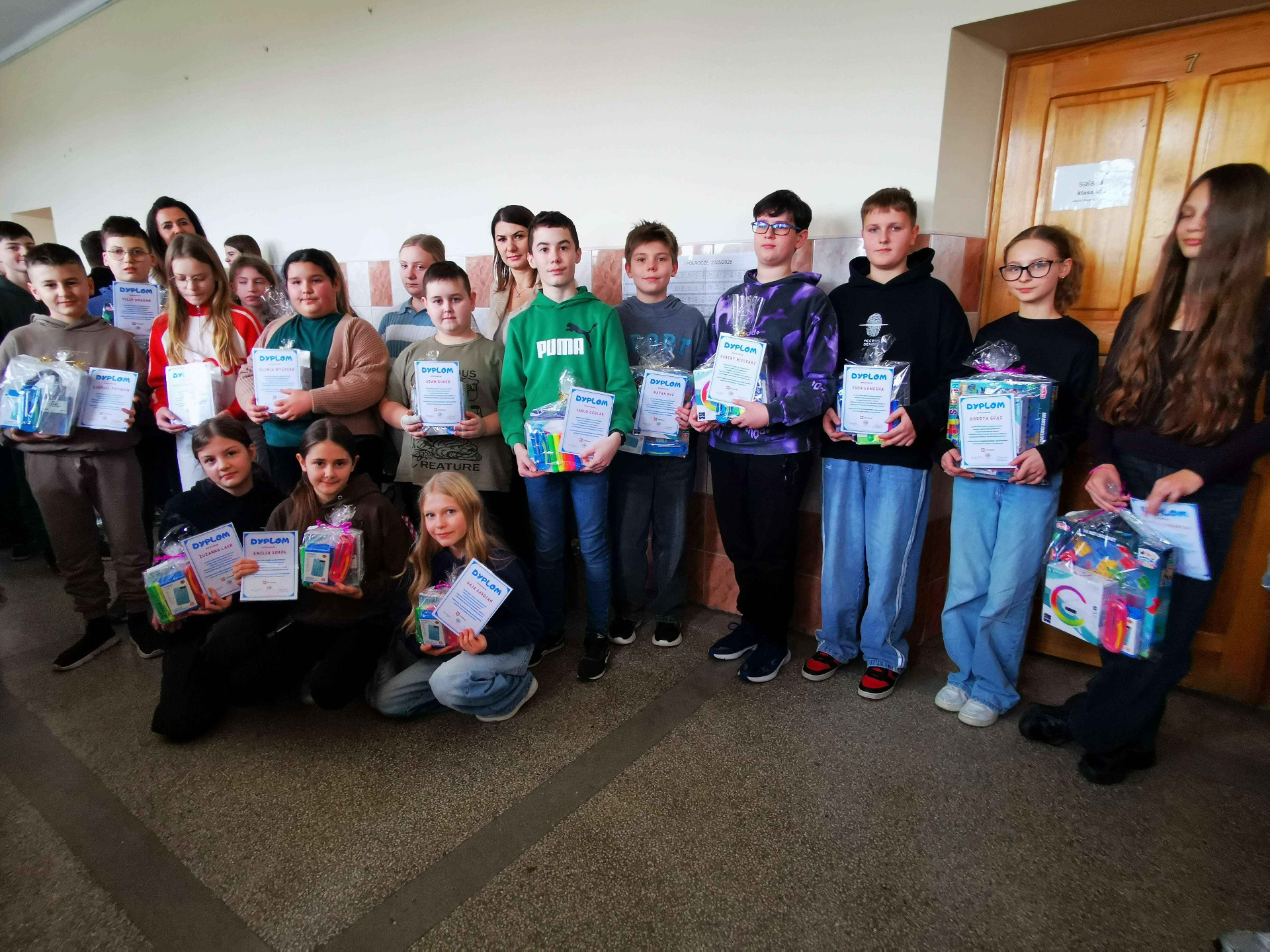 Podczas spotkania uczniowie odebrali nagrody za udział i zaangażowanie w realizację projektu, które wręczyła Pani Dyrektor. Wręczenie nagród było okazją do podkreślenia wysiłku uczniów, ich kreatywności oraz aktywnego udziału w warsztatach.